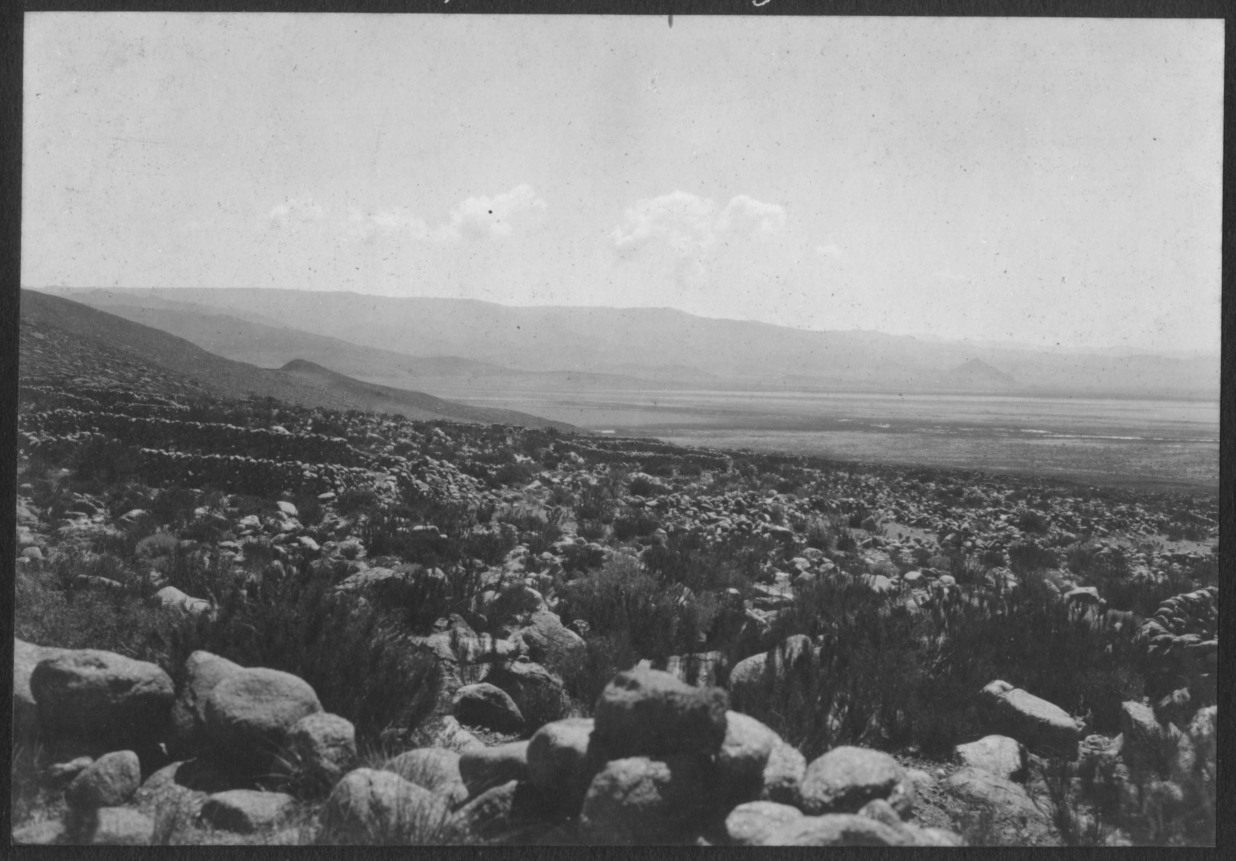 Finizzola, Segundo. 1923. "Vista panorámica de los recintos indígenas de siembra (todavia en uso) tomada desde el puesto de S. Pachiado hacia el Este". MLP-Ar-BMB-F1042. Culturalis. División Arqueología, Museo de La Plata, FCNyM, UNLP.
