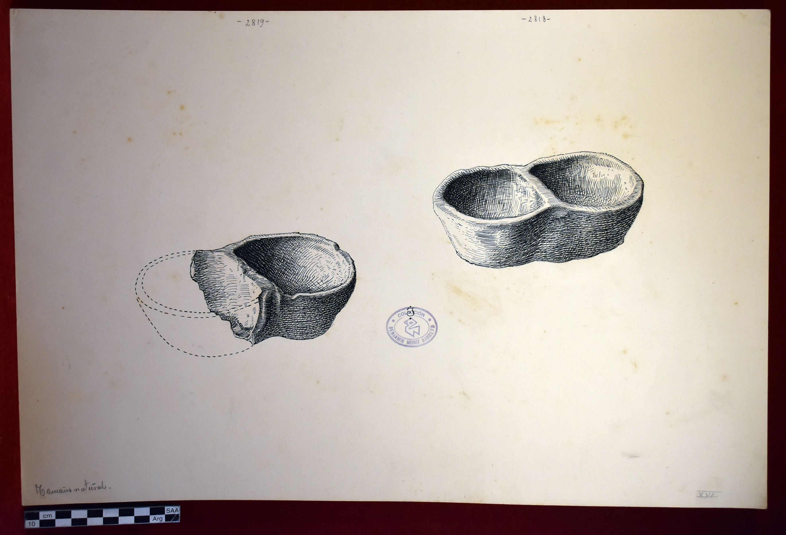 Dibujo de dos cuencos de piedra encontrados en Puerta de Juella, Jujuy, Argentina. La pieza 2819 se encuentra representada con un fragmento faltante, de altura 39 ctm. La pieza 2818 tiene una altura de 36 ctm. Ambas pertenecen a la colección Benjamín Muniz Barreto.