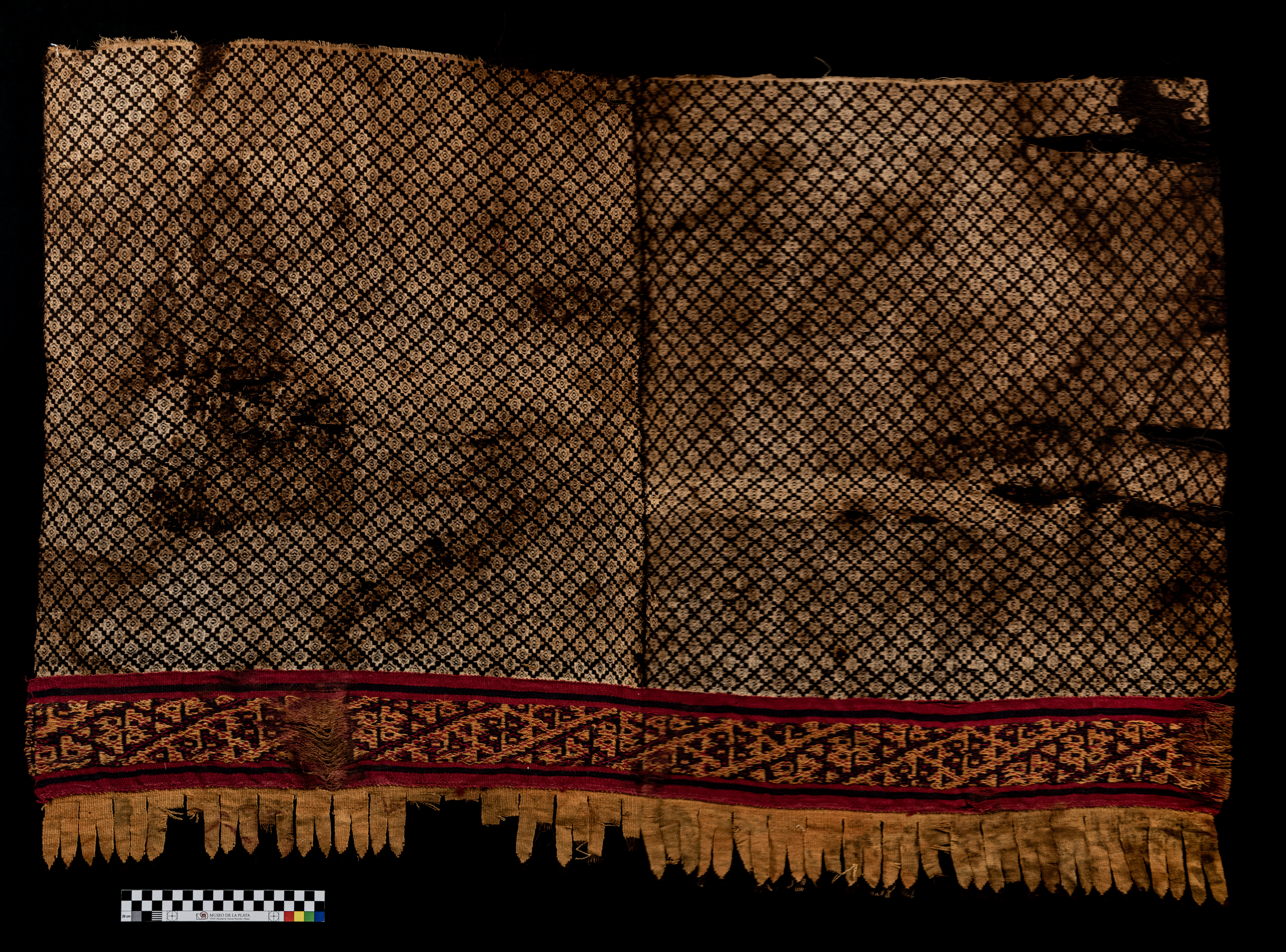 Fragmento textil realizado en tejido llano balanceado, con diseños en tramas suplementarias. Presenta una orla cosida al campo realizada con tramas complementarias. A continuación una flecadura tejida en faz de trama y cosida a la pieza. El diseño del campo es bos escalonados. la orla tiene un diseño de de aves estilizadas dispuestas en diagonal. El color de base del campo es natural, con diseños en marrón. La orla presenta colores, rojo y amarillo y marrón, y la flecadura es amarilla.