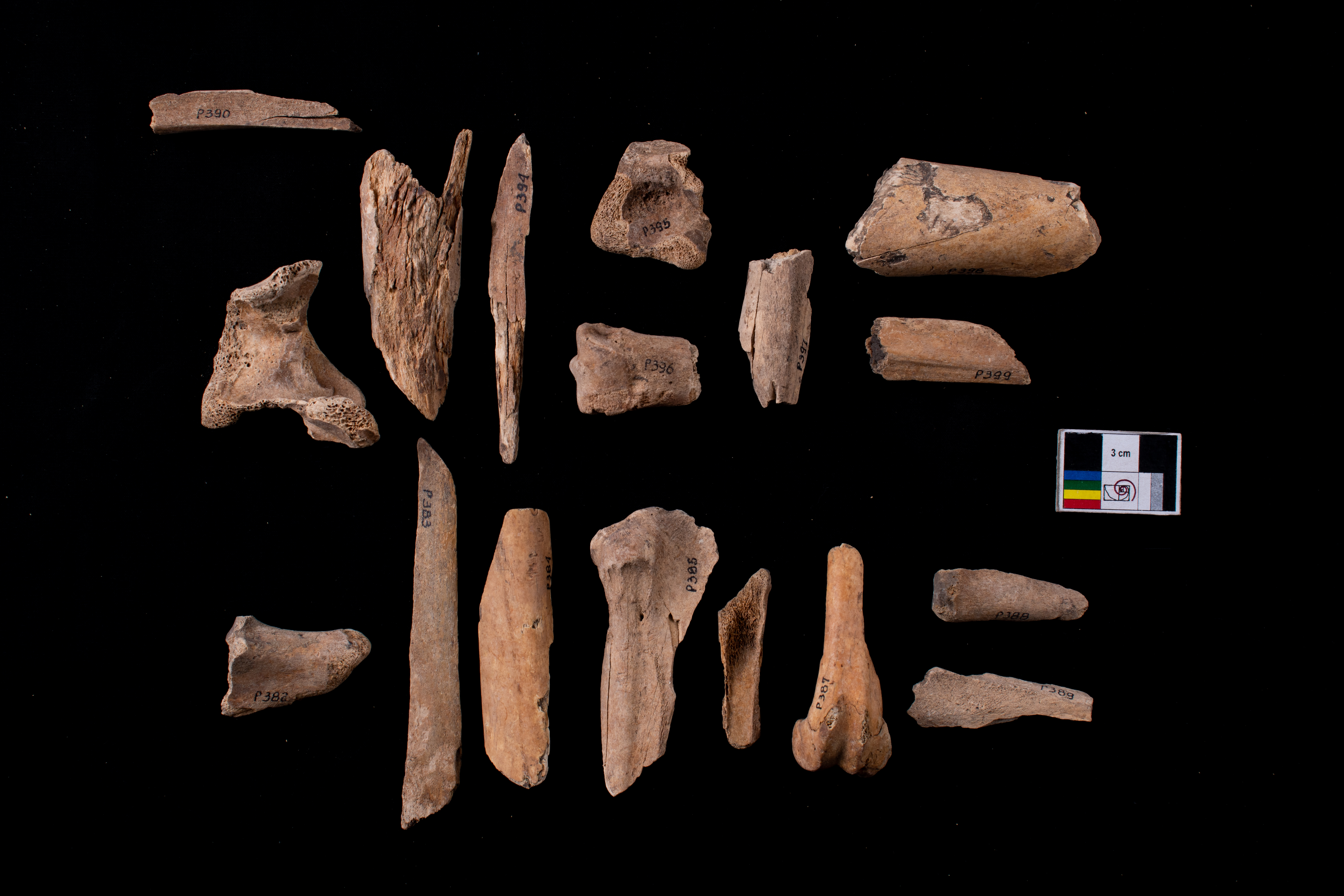Se observan 17 fragmentos de hueso de fauna, fragmentos de huesos largos, costillas, etc.