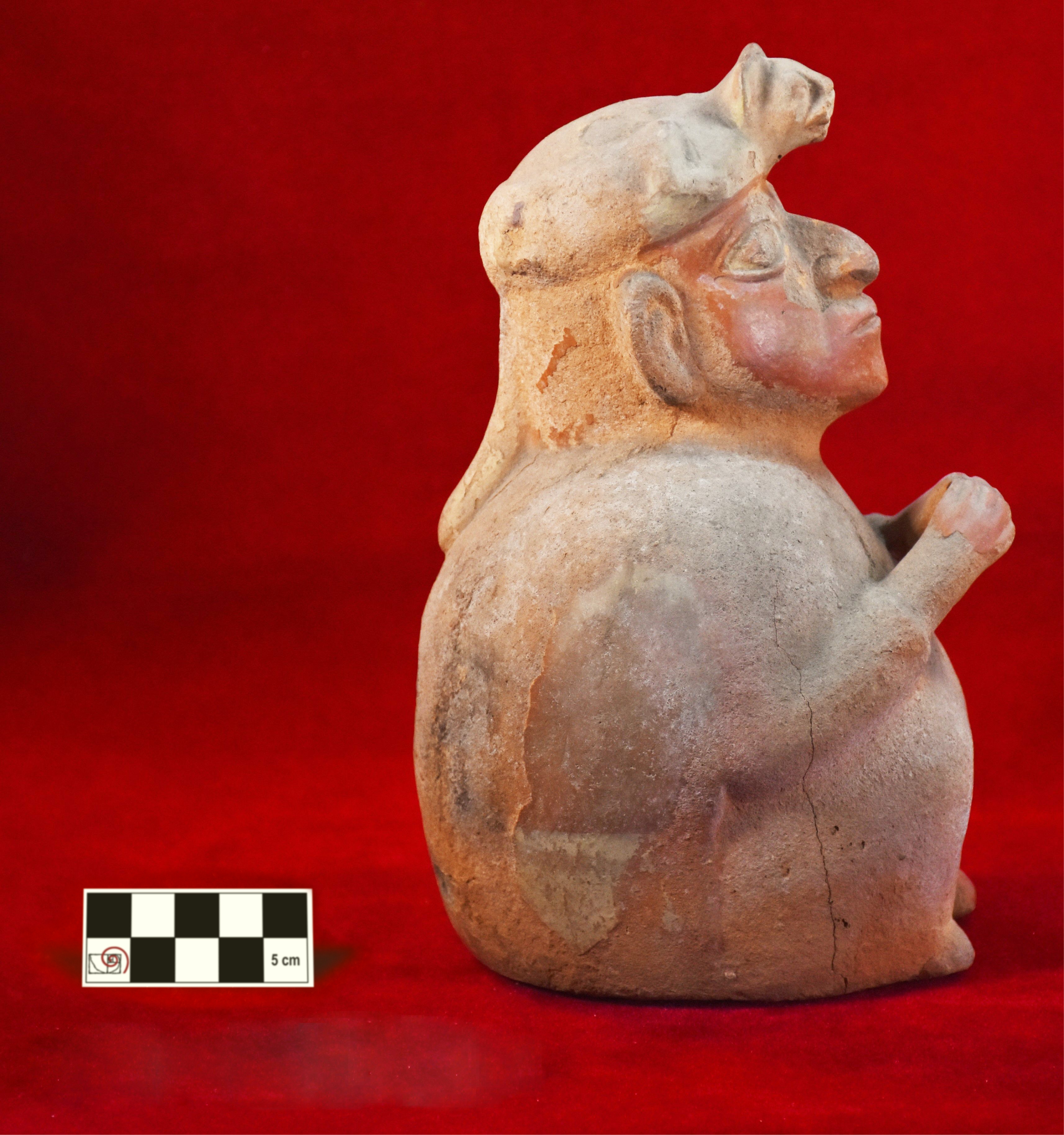 Vasija globular modelada con figura antropomorfa con tocado zoomorfo.