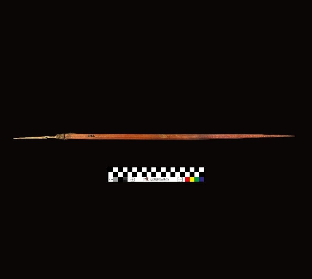 Se trata de un astil de flecha madera que presenta en uno de sus extremos restos de atadura de tendón de emplumadura y resina. En el extremo opuesto se encuentra la atadura de tendón que sujeta solo la base de una punta rota, aparentemente de vidrio.