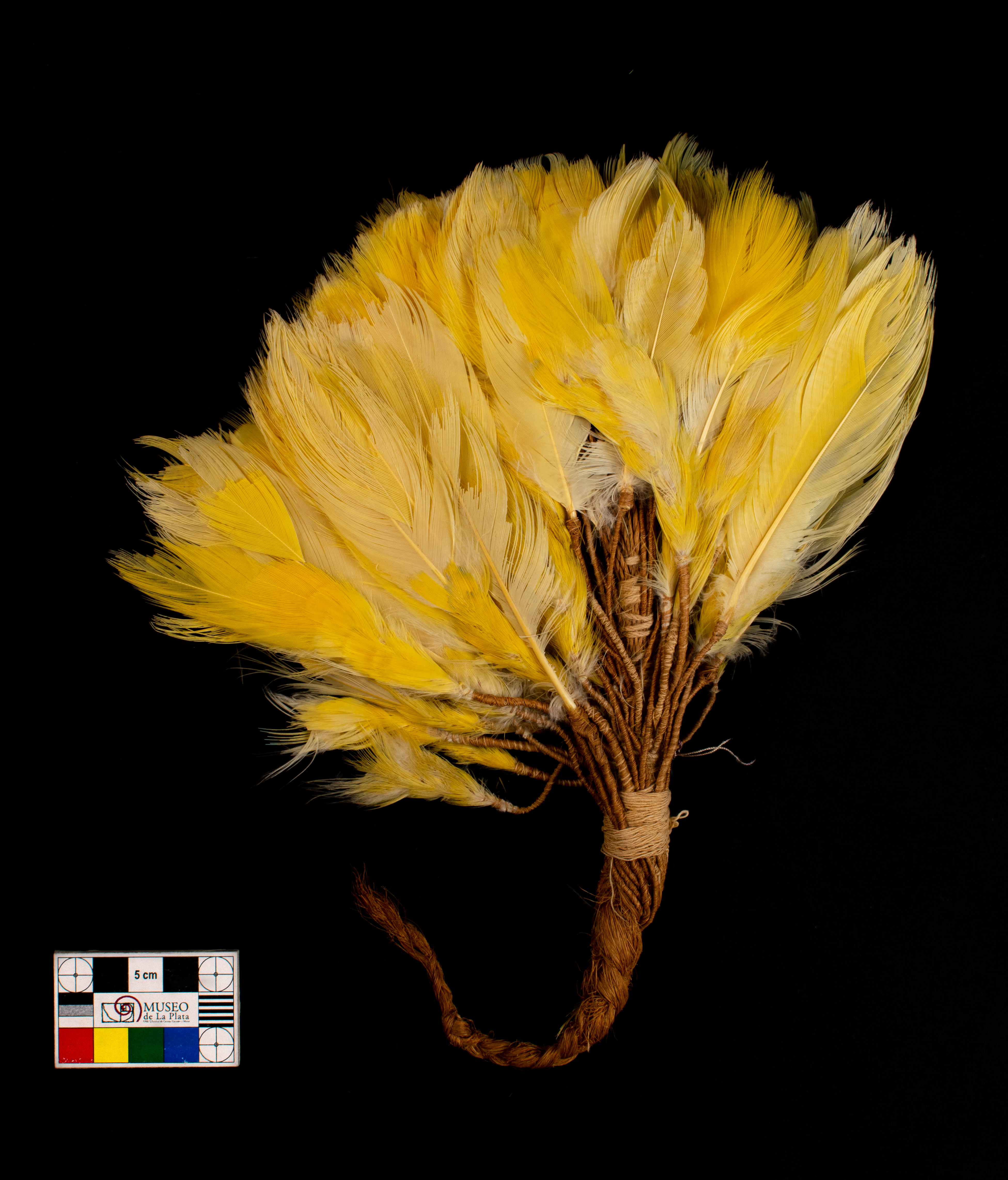 Ornamento plumario en forma de penacho, relizado con plumas largas de color amarillo, sugetas a un haz de fibras vegetales sin retorcer, Primeramente se ha envuelto el cañón con un hilo y agregado en esa envoltura plumones amarillo oscuro a la base de cada pluma; y por último se las ha sugetado con la fibra vegetal. A su vez las fibras vegetales se han reagrupado en tres haces, los que fueron trenzados, formando una trenza que se va afinando hacia el extremo.