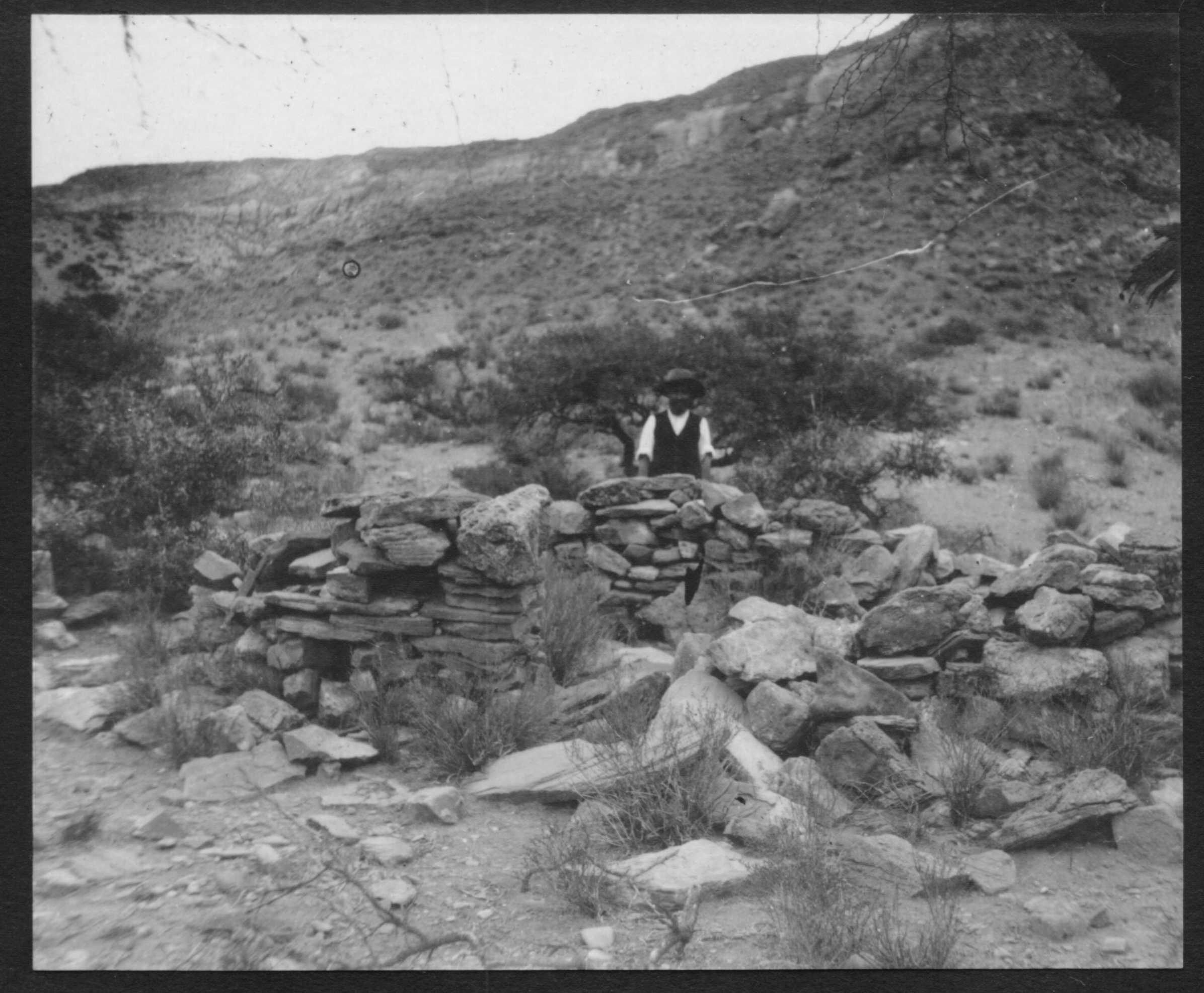 | dc.description | Se observa una construcción de pircas y un hombre con sombrero y chaleco detrás. | |