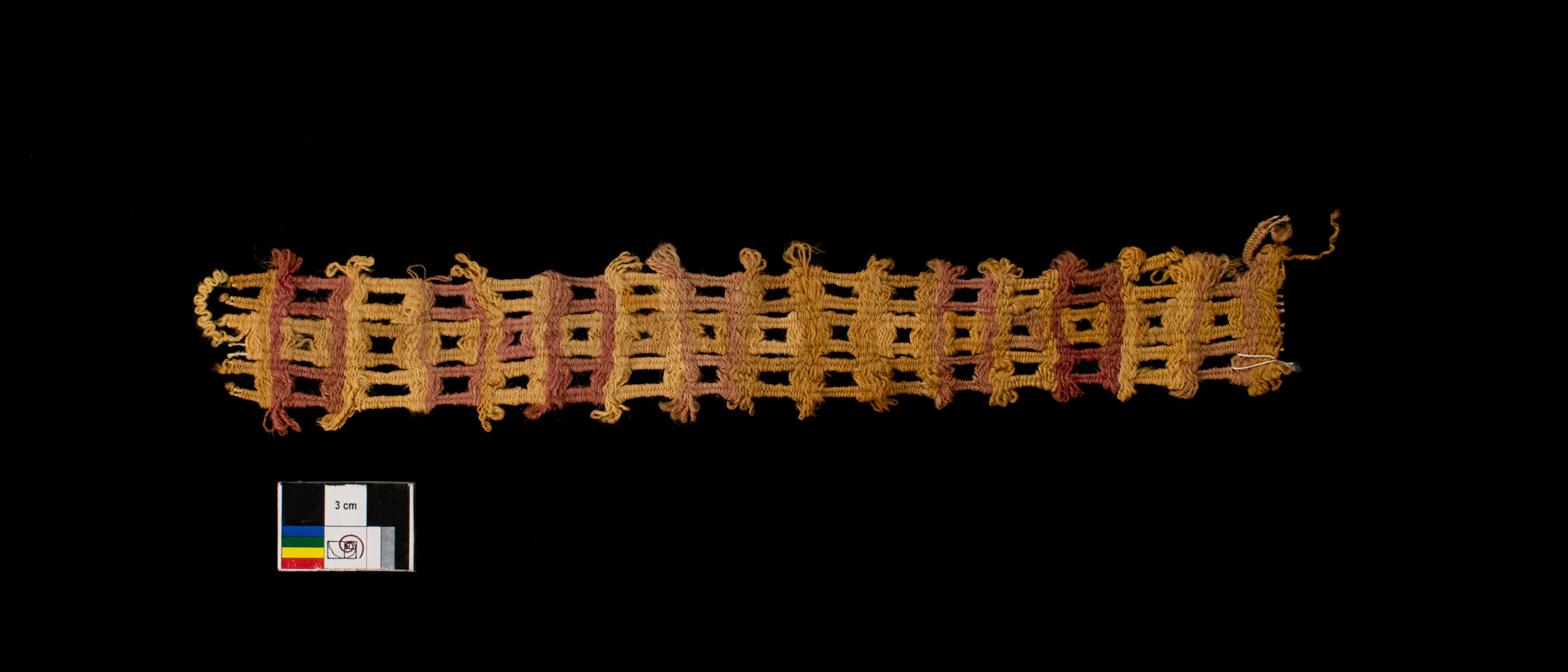 Fragmento de orla, realizada en faz de trama, tejido llano, con diseños en tramas discontinuas separadas, formando ojales y ventanas, una fina banda sujeta de tanto en tanto al cuerpo principal. Colores: dos tonos de amarillo, rosa y rojo.