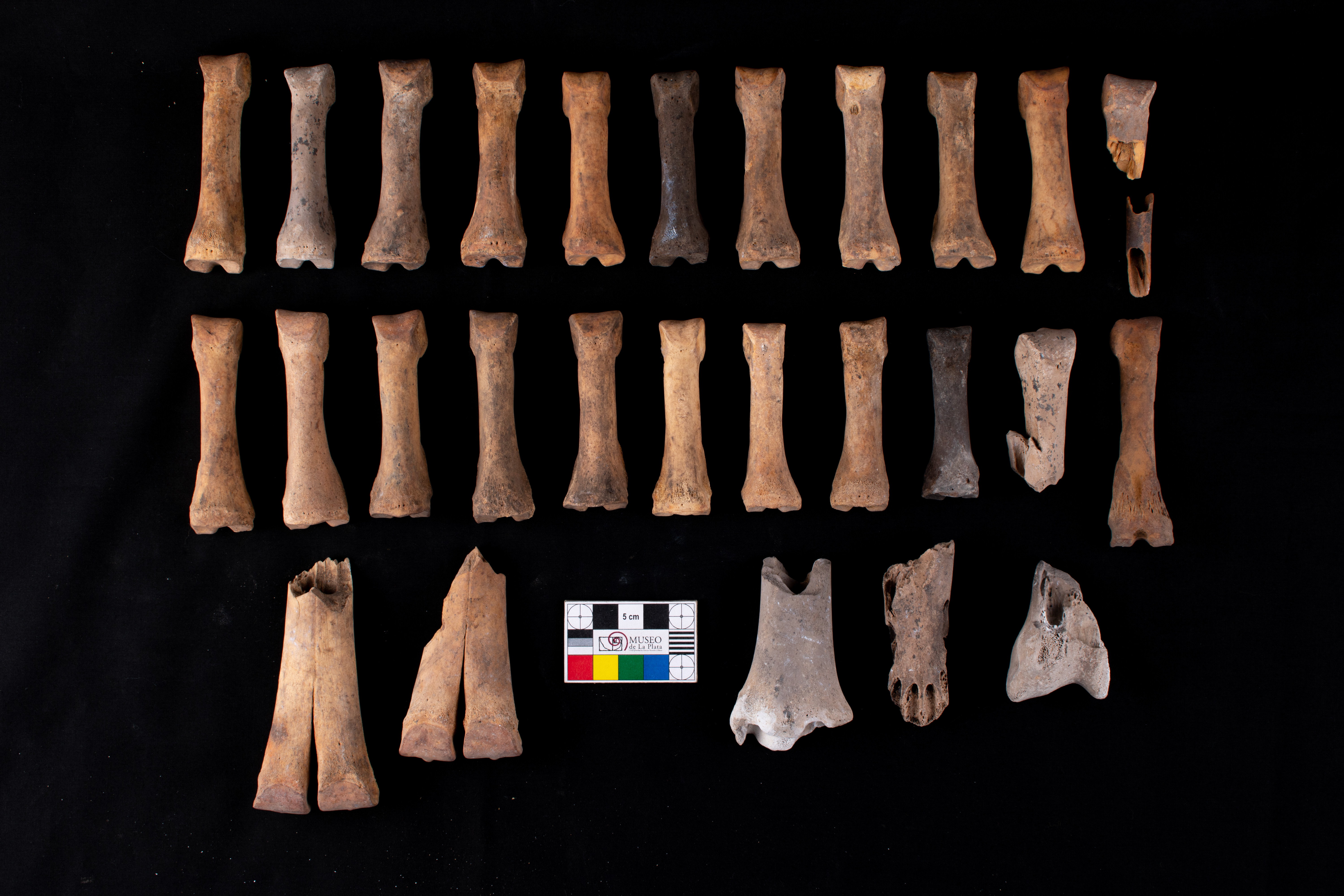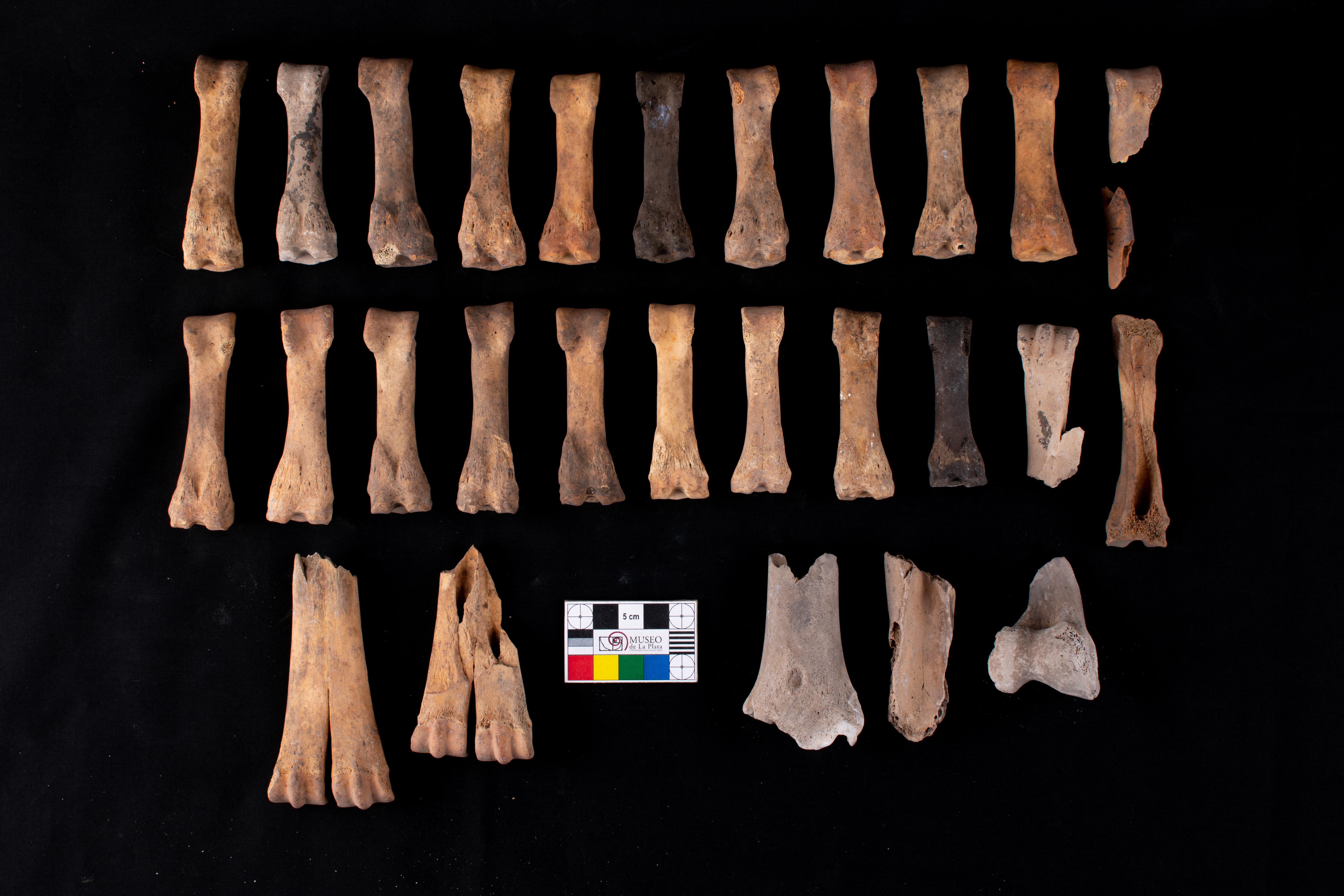 Se observan metatarsos enteros, fragmentados, fragmento de maxilar y otros