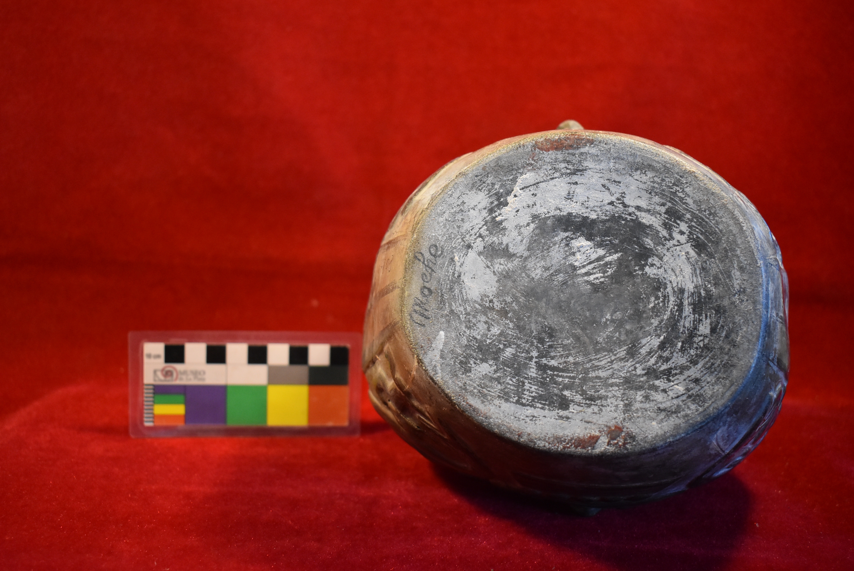 | dc.description | Vasija de forma irregular cerrada con asa estribo color gris con decoracion pintada en negro y reliece von figuras zoomorfas y antropomorfas | |