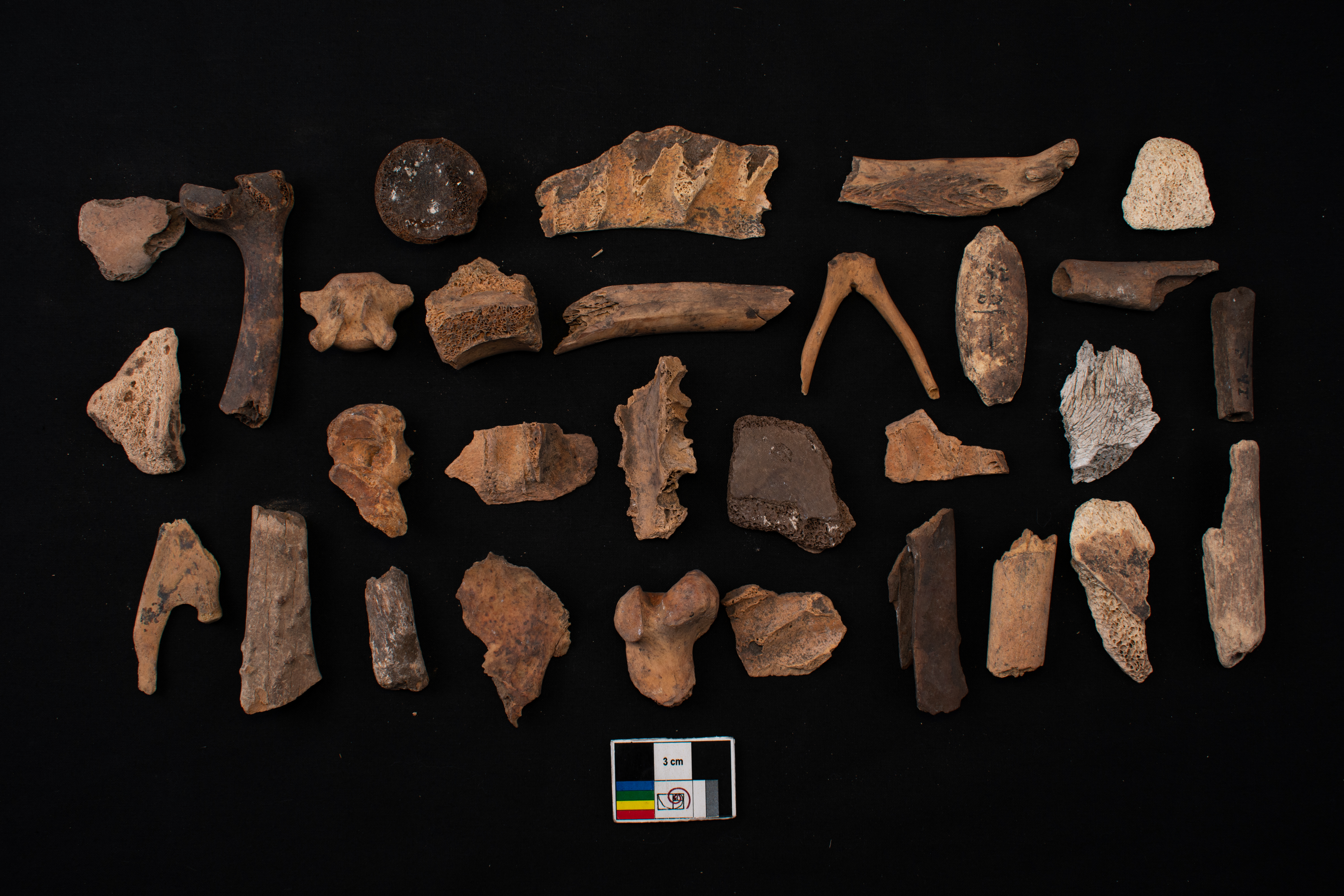 Se observan fragmentos de huesos largos, costillas, vertebras, entre otros