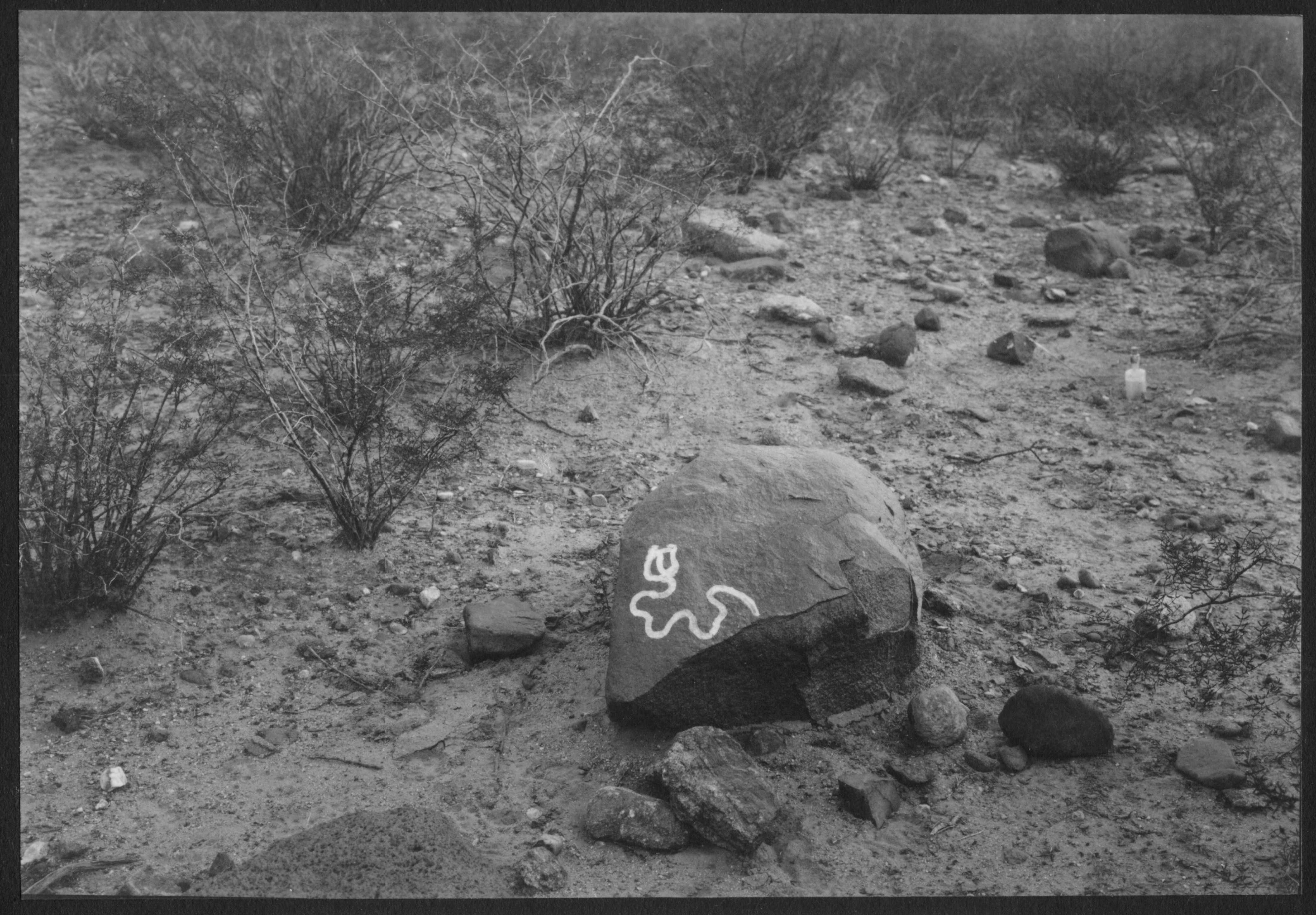 Se observa una piedra grabada con un motivo remarcado con tiza, en el "Campo del Ingenio"
