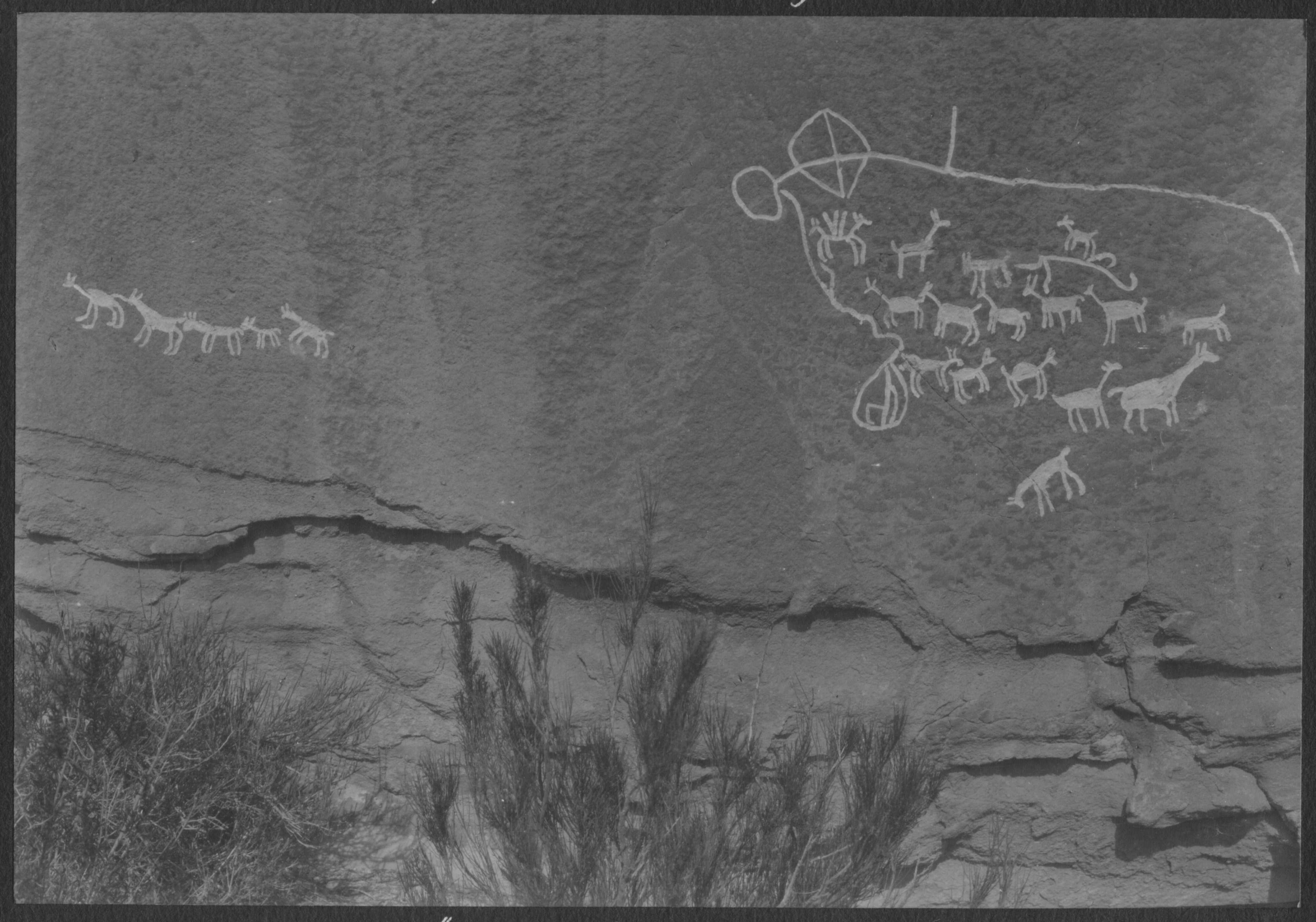 Se observan grabados en la roca del afloramiento del "Potrero", con motivos zoomorficos de camelidos, de diferentes tamaños
