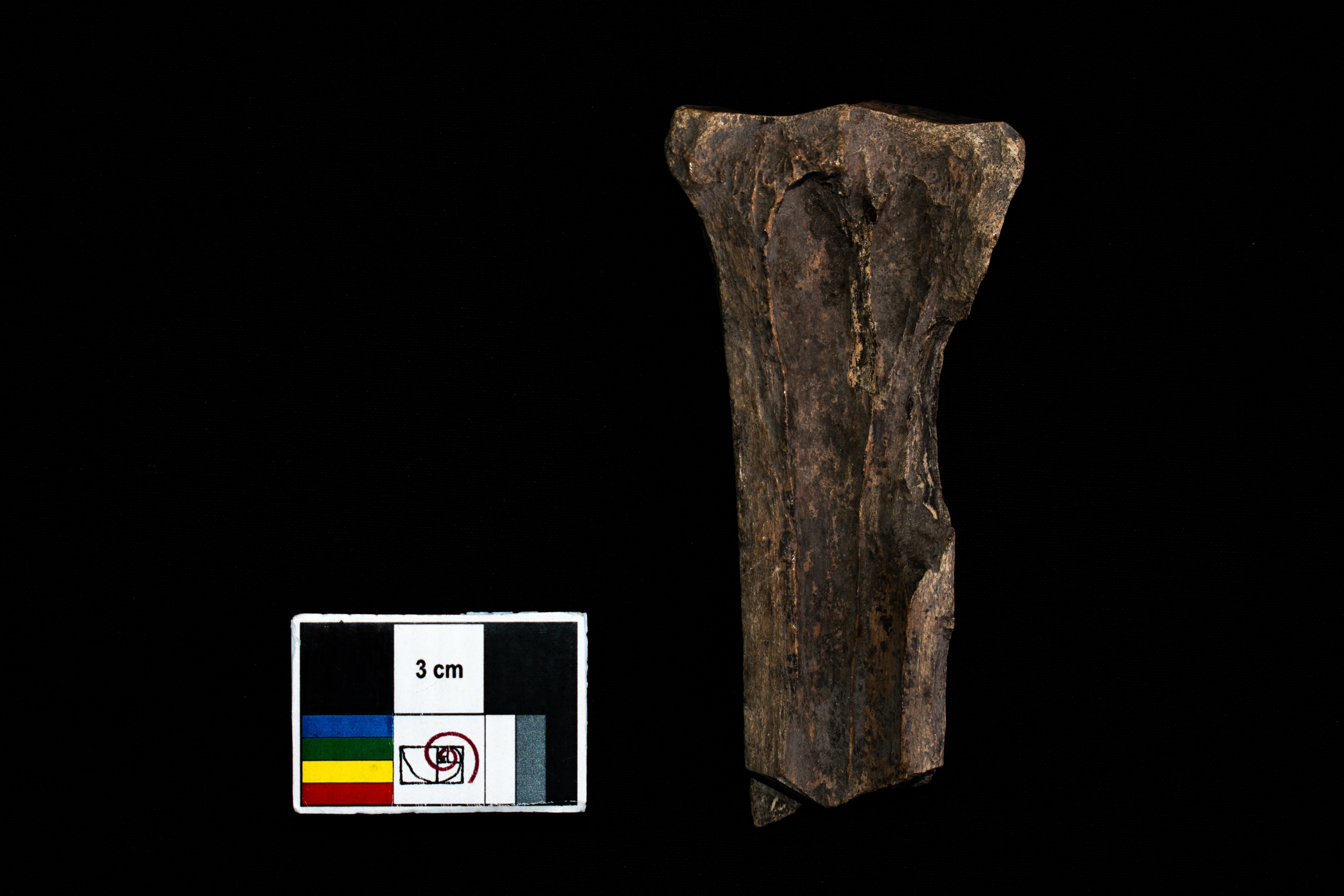 Metapodio de guanaco con fractura helicoidal, muesca de impacto o huellas de corte