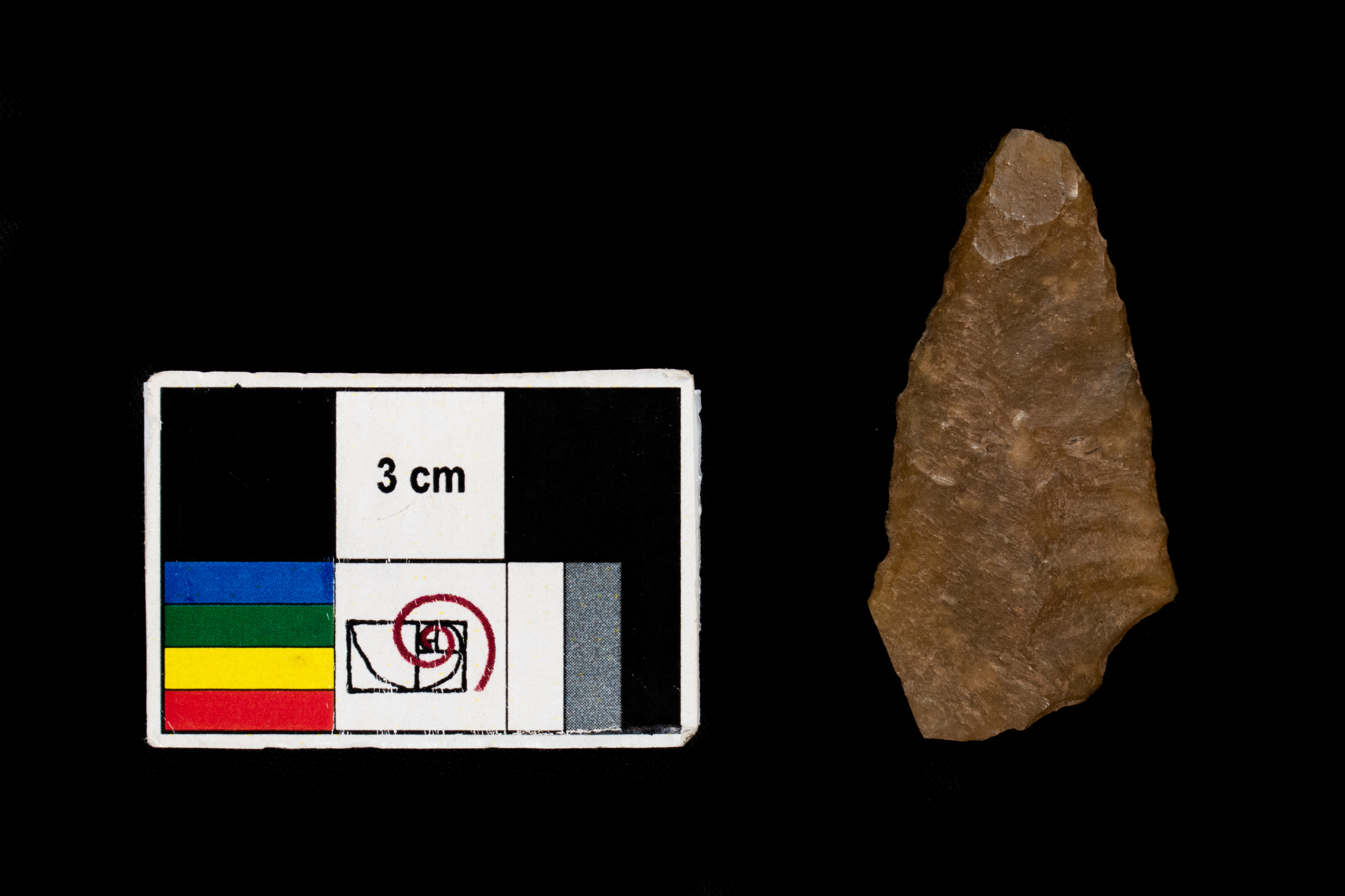 Punta solutrense de sílex de cara plana. Presenta la base frac turada