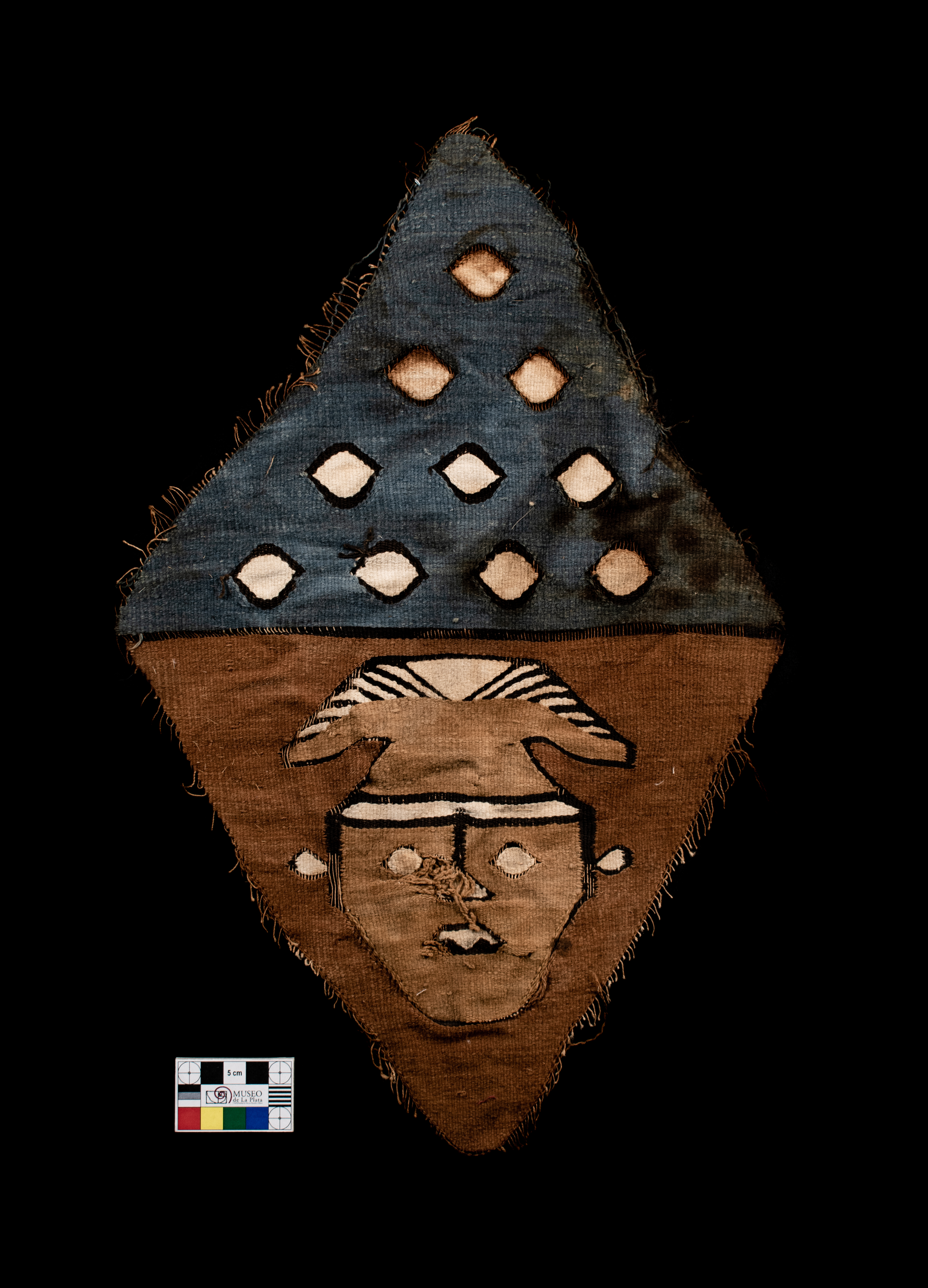 | dc.description | Fragmento textil, realizado en tejido llano balanceado con diseños pintados. Presenta una cra humana estilizada en marrón oscuro, con un tocado en forma de tumi invertido.En el borde superior presenta restos de un ribete bordado. | |
