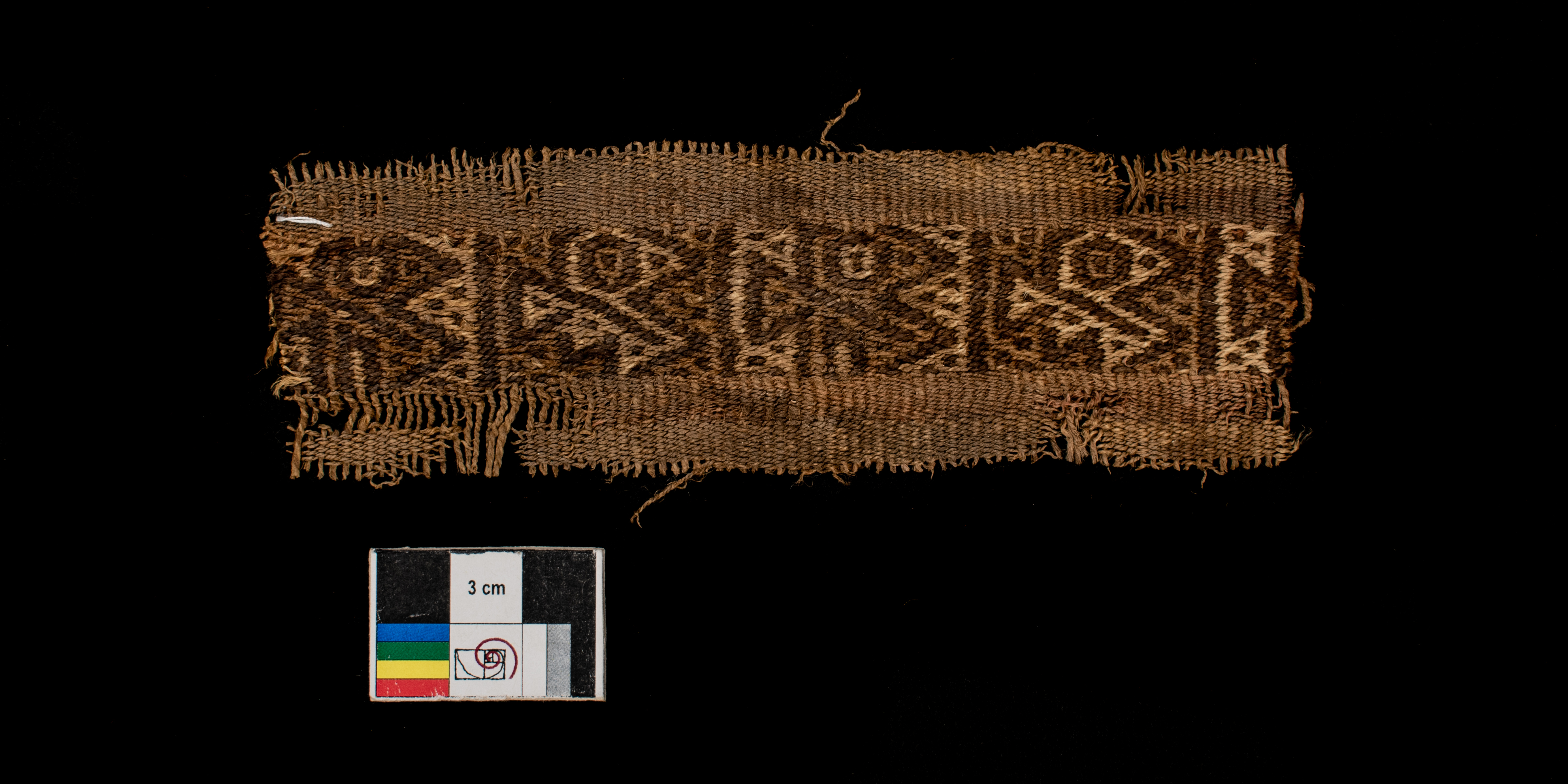 Fragmento textil, con dos orillos. Realizado en faz de urdimbre, urdimbres complementarias alternadas 2/2; con diseño de aves estilizadas. Colorers. Marrón oscuro, natural y tostado.