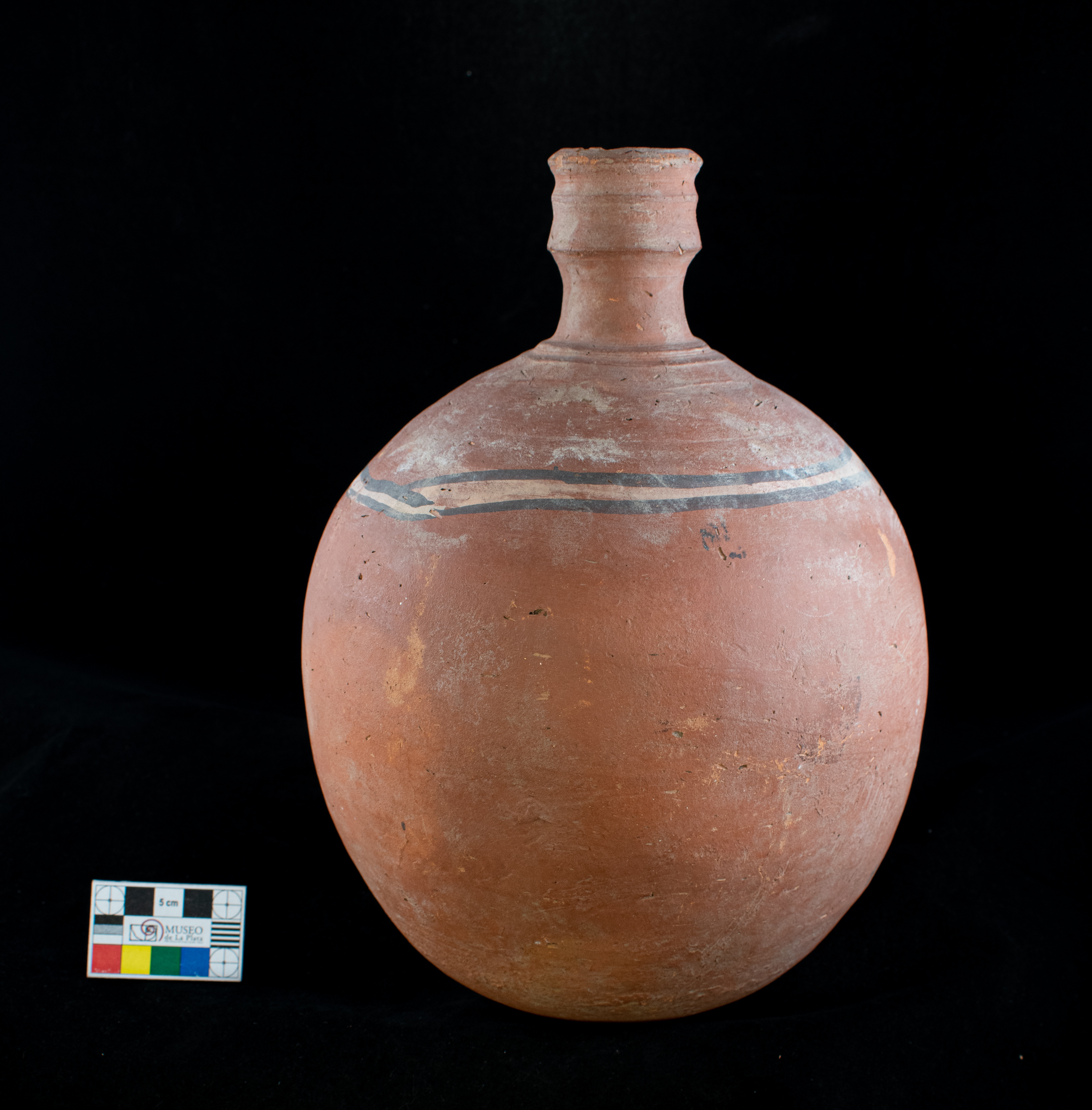 Vasija grande, redondeada, con cuello fino y boca chica, con dos lineas negras dibujada alrededor del cuerpo