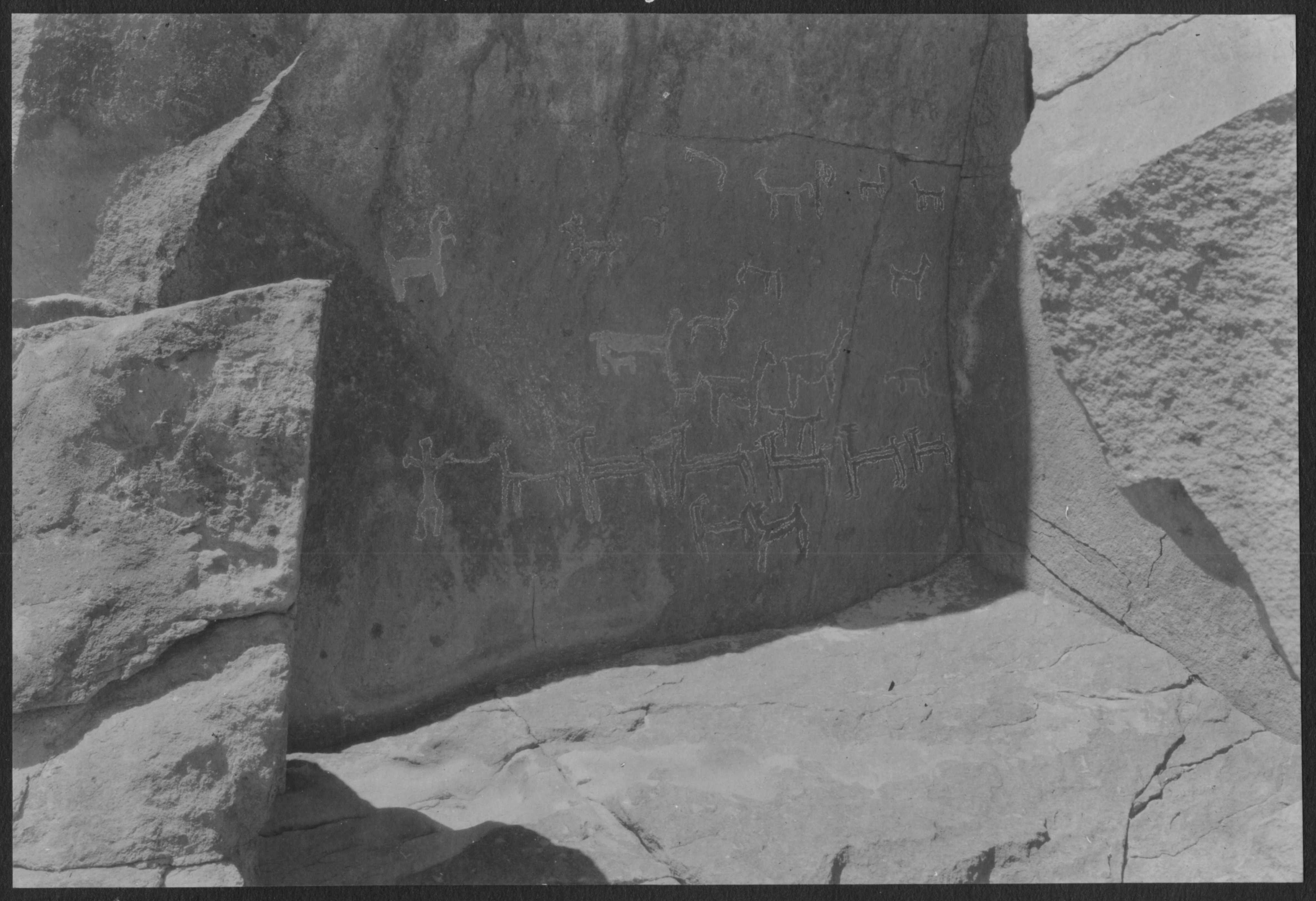 Petroglifos con motivos zoomorfos. Se observan escenas de camelidos con sus crias y uno mamando, fila de camelidos atados por el cuello y al inicio de la fila se encuentra un personaje antropomorfo.