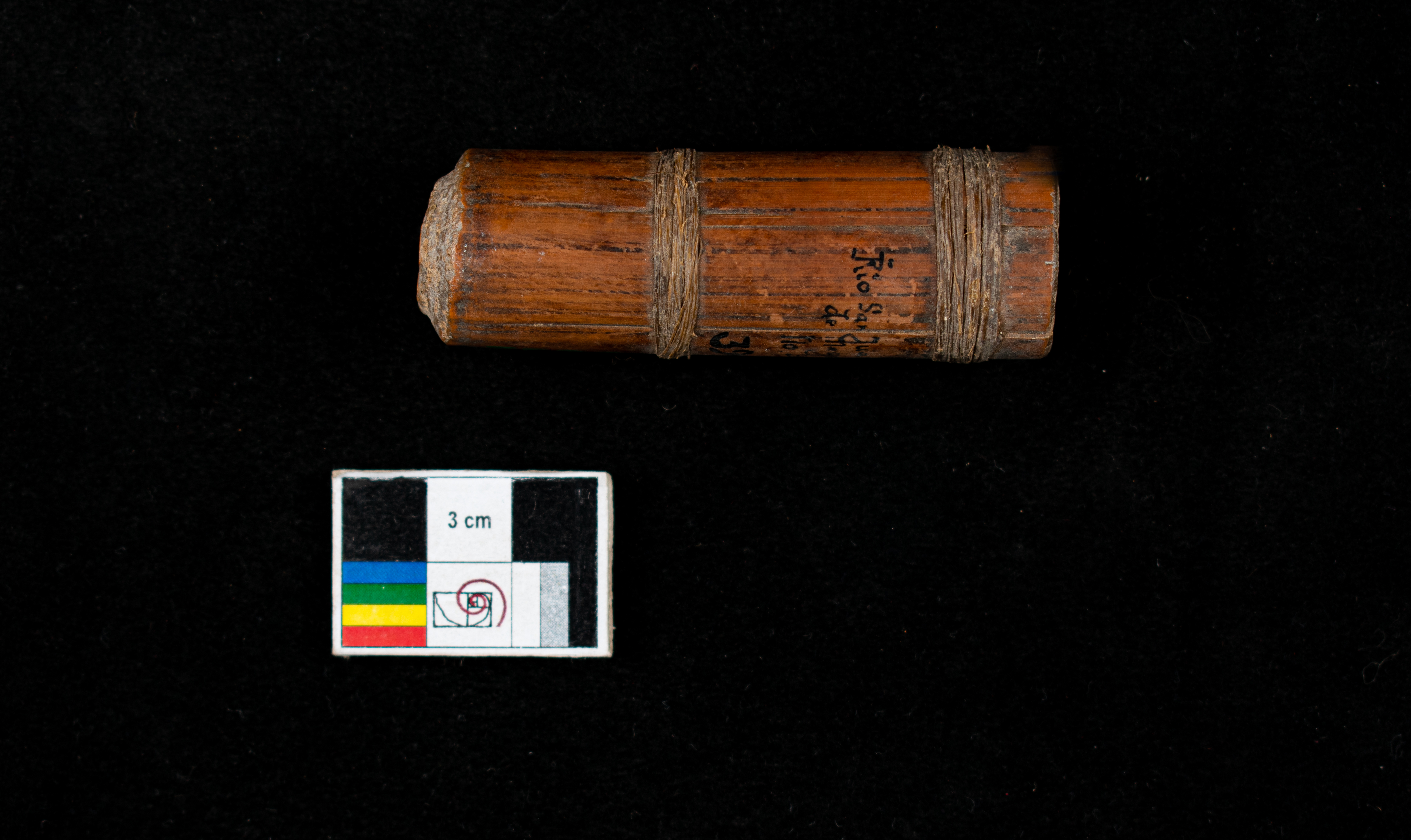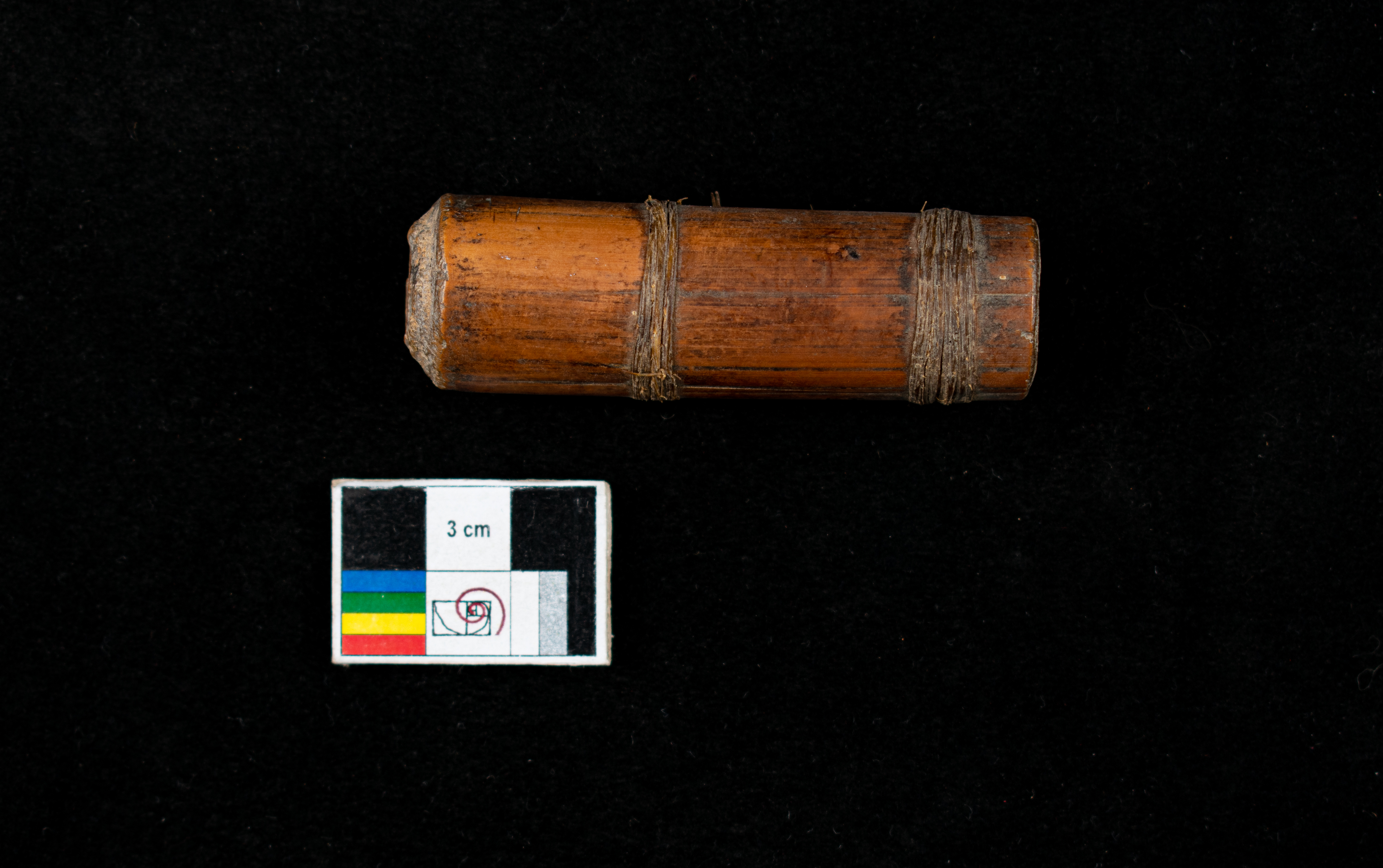contenedor de caña atado con dos vueltasde tendones con tapa de cuero (no está). contiene 3 huesos de ave (N°3468)