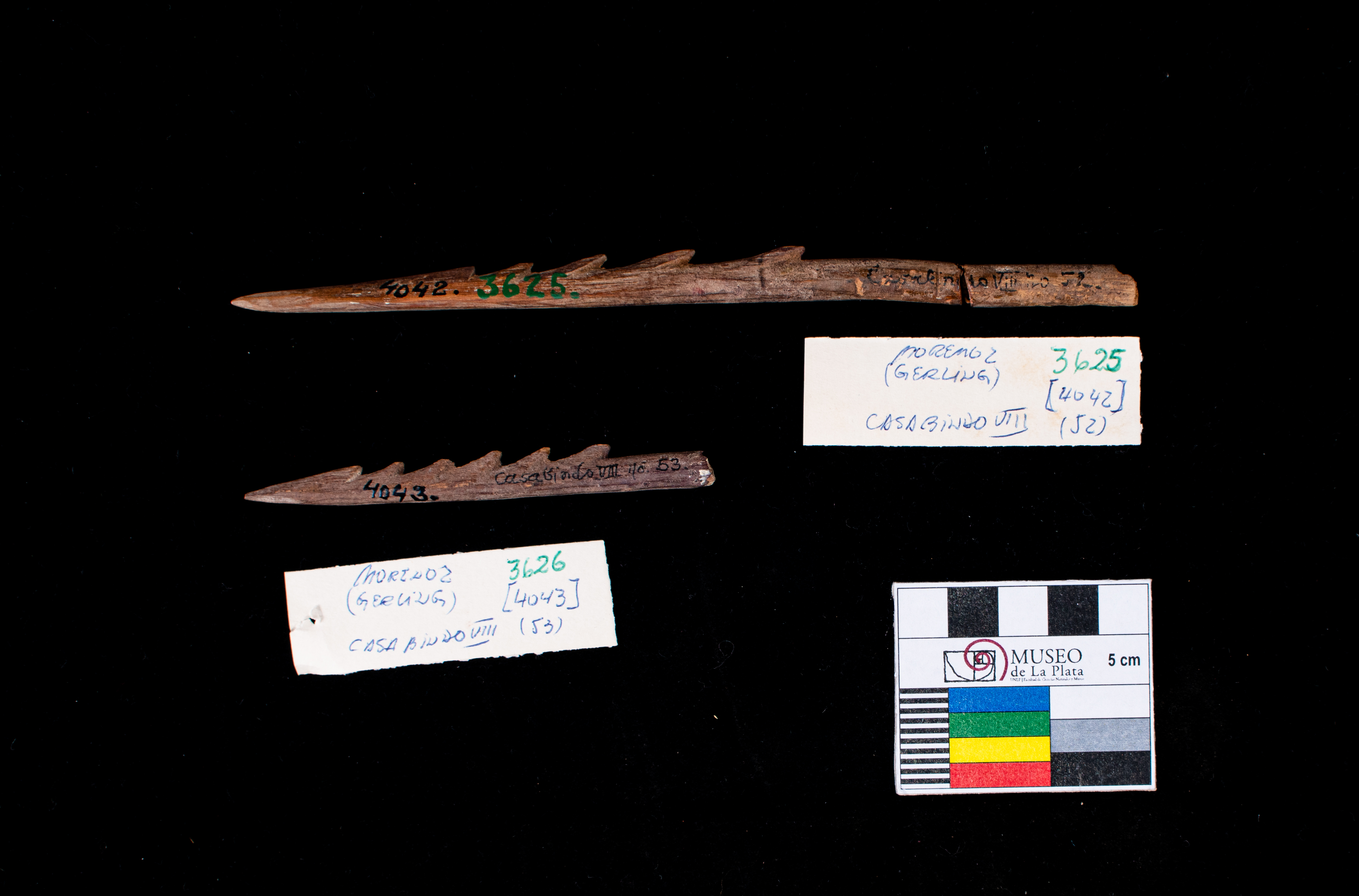 | dc.description | Dos puntas de arpon de madera, la número 3625 tiene un fragmento que remonta. Ambas son de Casabindo VIII, Jujuy, las incripciones se encuentran en las piezas. | |