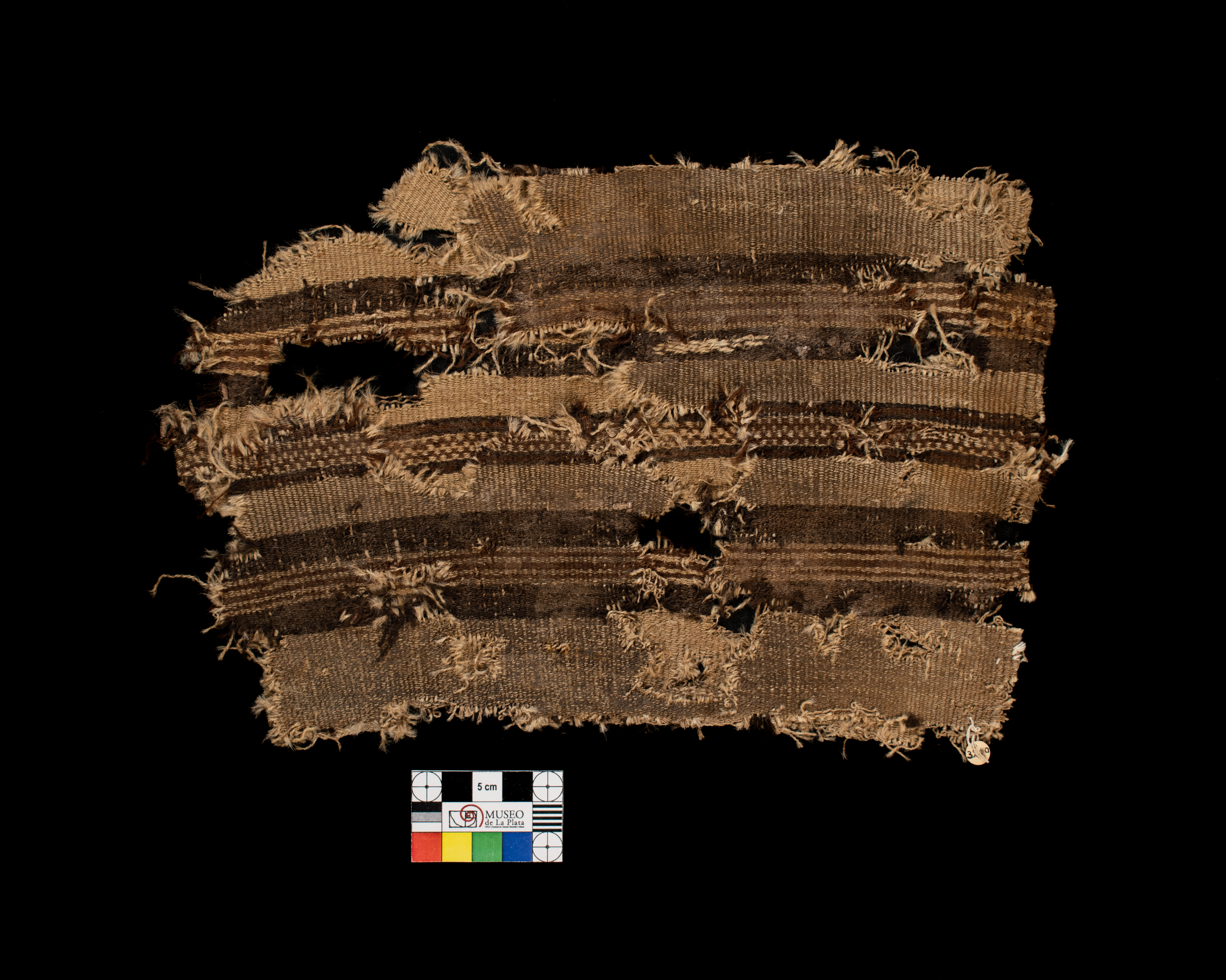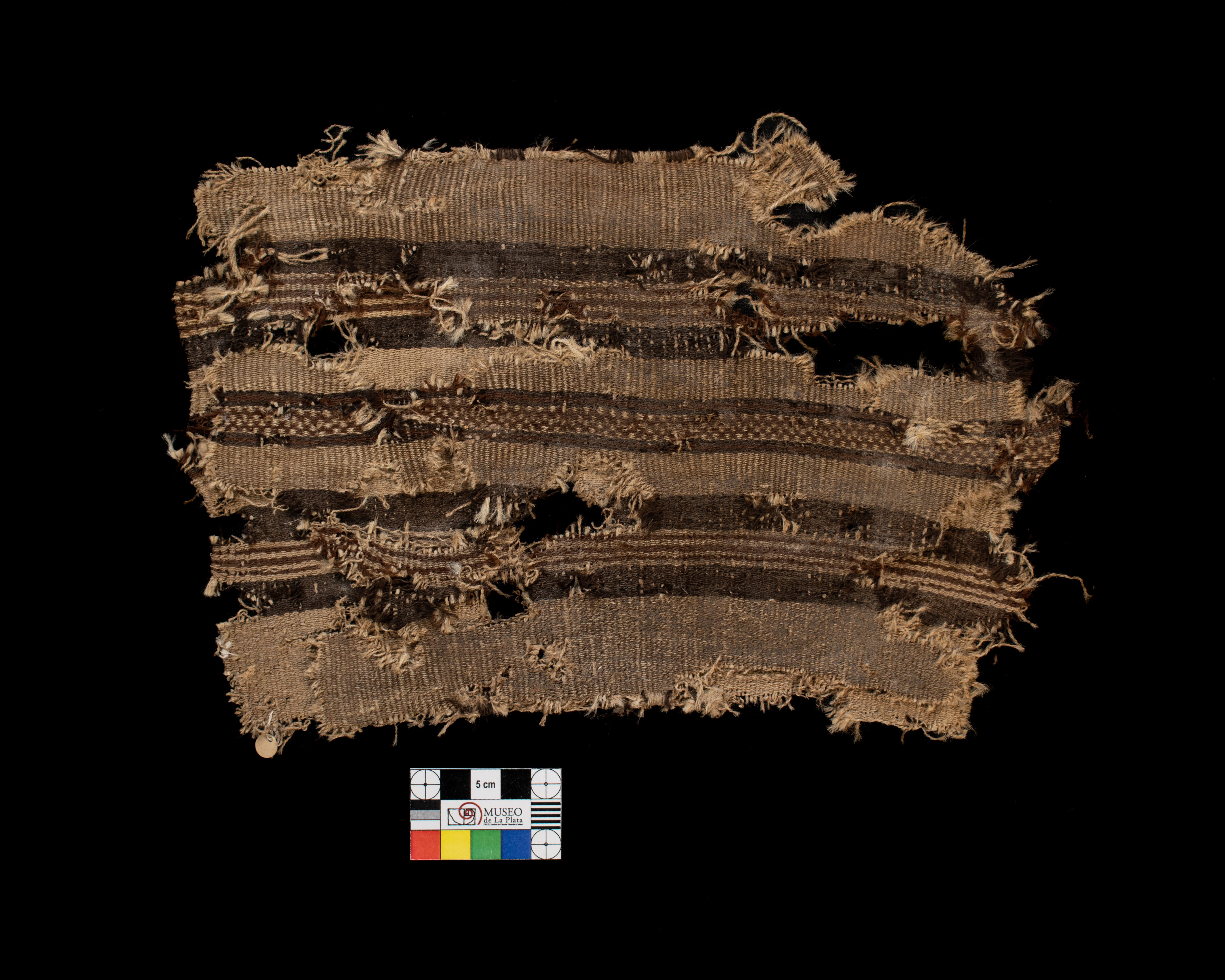 Fragmento de bolsa, realizada en lana de camelido, tejida en faz de urdimbres, tejido llano, con guarda con diseño de peinecillos. Colores utilizados, marrón, beige y tostado