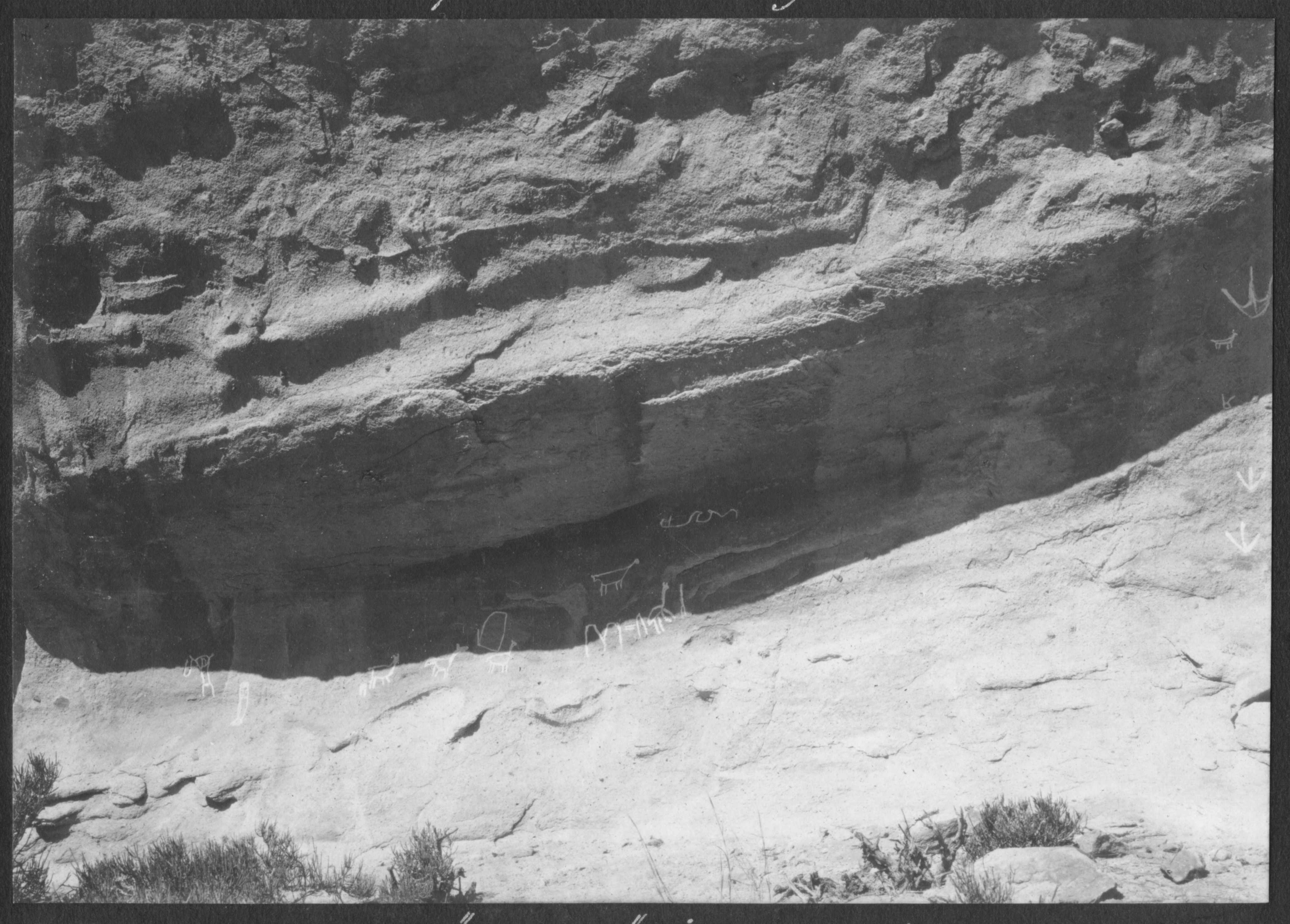 | dc.description | Se observan grabados en la roca del afloramiento del "Potrero", con diferentes motivos remarcados con tiza. Destacan representaciones de camelidos, posibles huellas de pisadas de animales y otros diseños. | |
