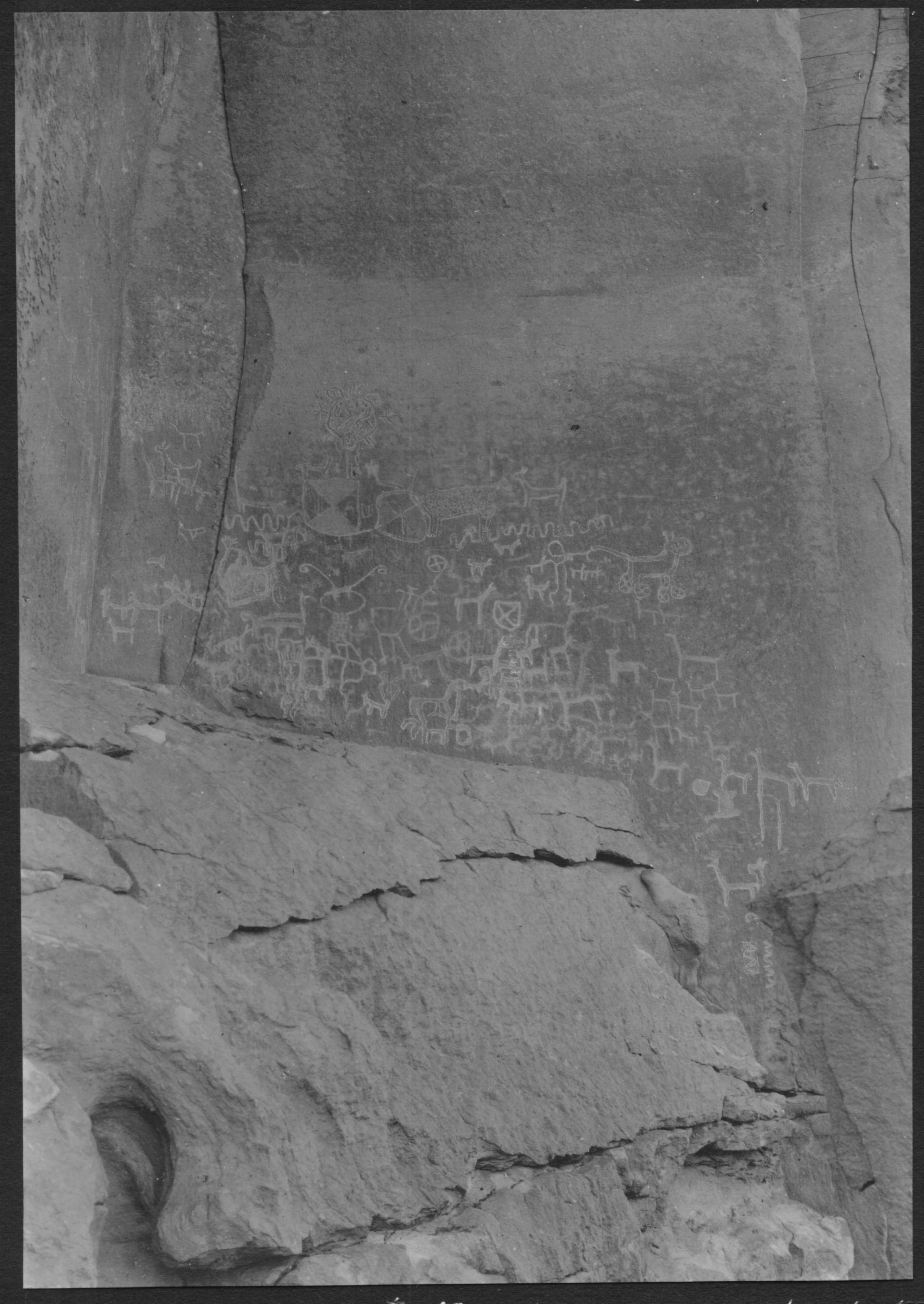 | dc.description | Se observan petroglifos con motivos zoomorfos, geométricos, etc, en una roca de la Quebrada Putas. | |