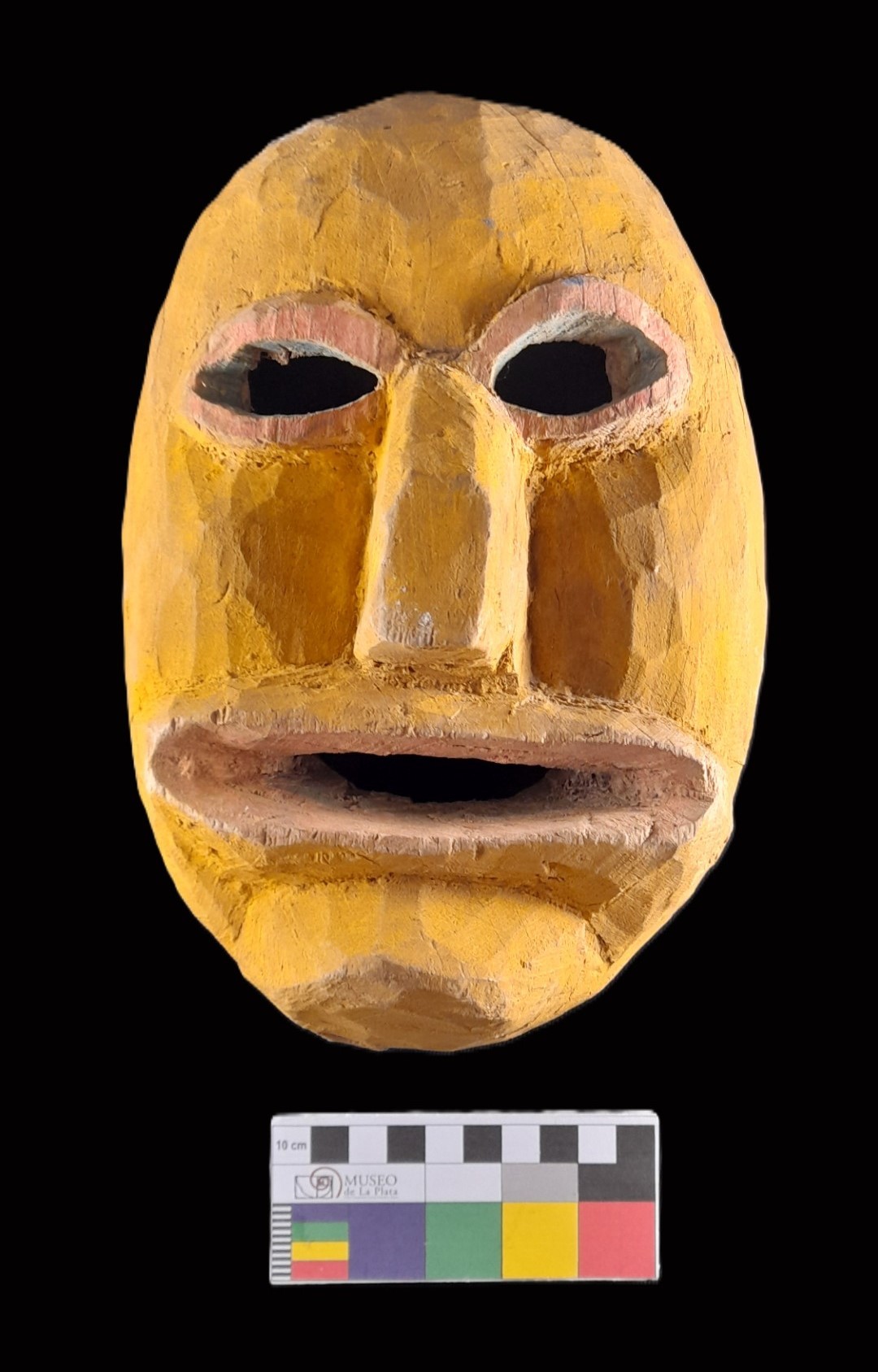 Máscara confeccionada en madera, con el rostro cubierto de pintura amarilla. Ojos perforados con reborde superior e inferior pintado de rojo. En su interior, pintura azul celeste. Nariz saliente con punta rectangular. Boca perforada de forma oval y posición horizontal. Presenta los labios inferior y superior en relieve, y su interior pintado de rojo. El mentón es saliente.