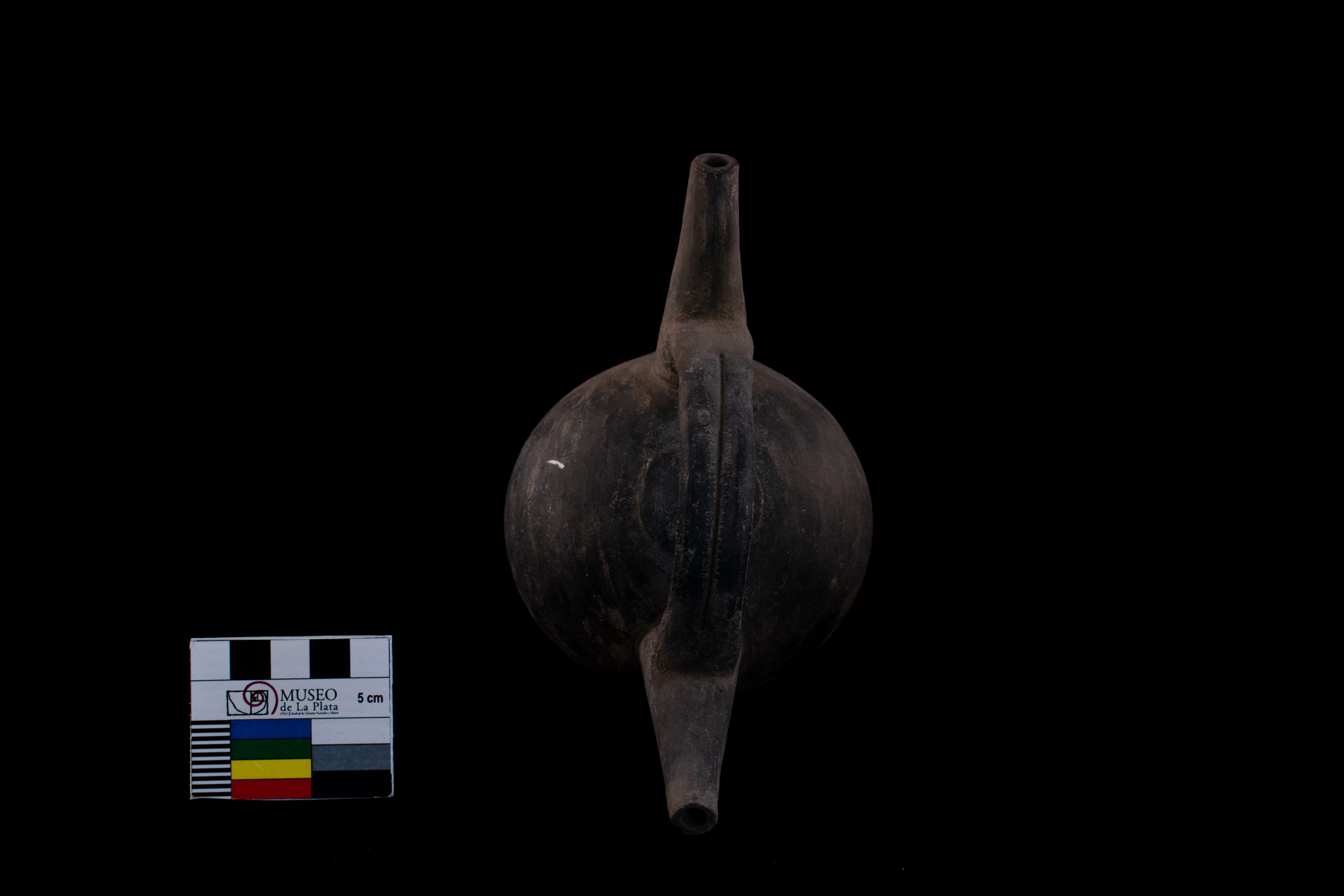 Vasija globular color negro con asa puente, la cual posee una línea. Posee apliques en los laterales y base.