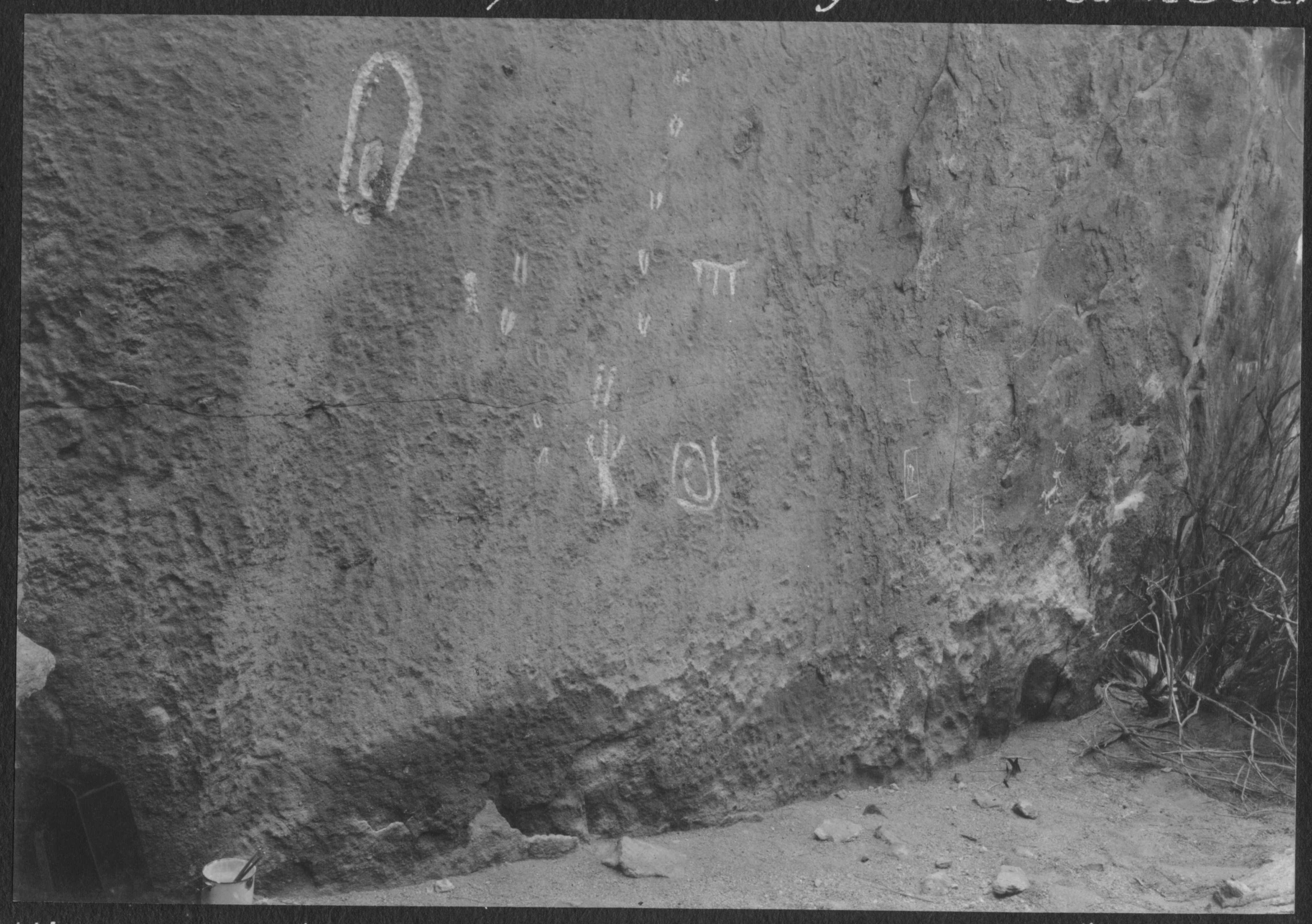 Se observan grabados en la roca del afloramiento de la quebrada "Charcomal", con diferentes motivos remarcados con tiza.