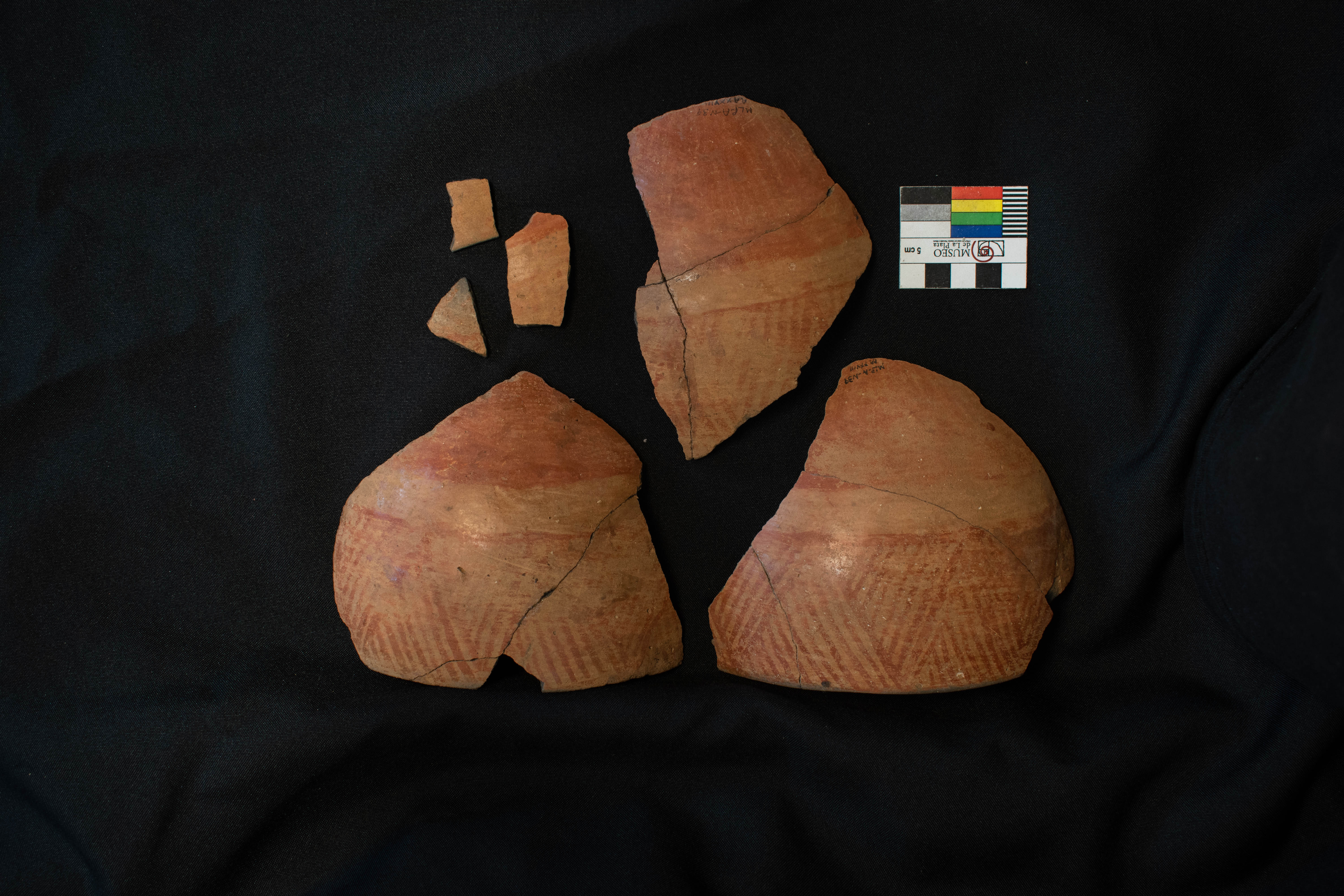 Fragmentos de cerámica, presunta vasija de tamaño mediana con guardas pintadas en rojo