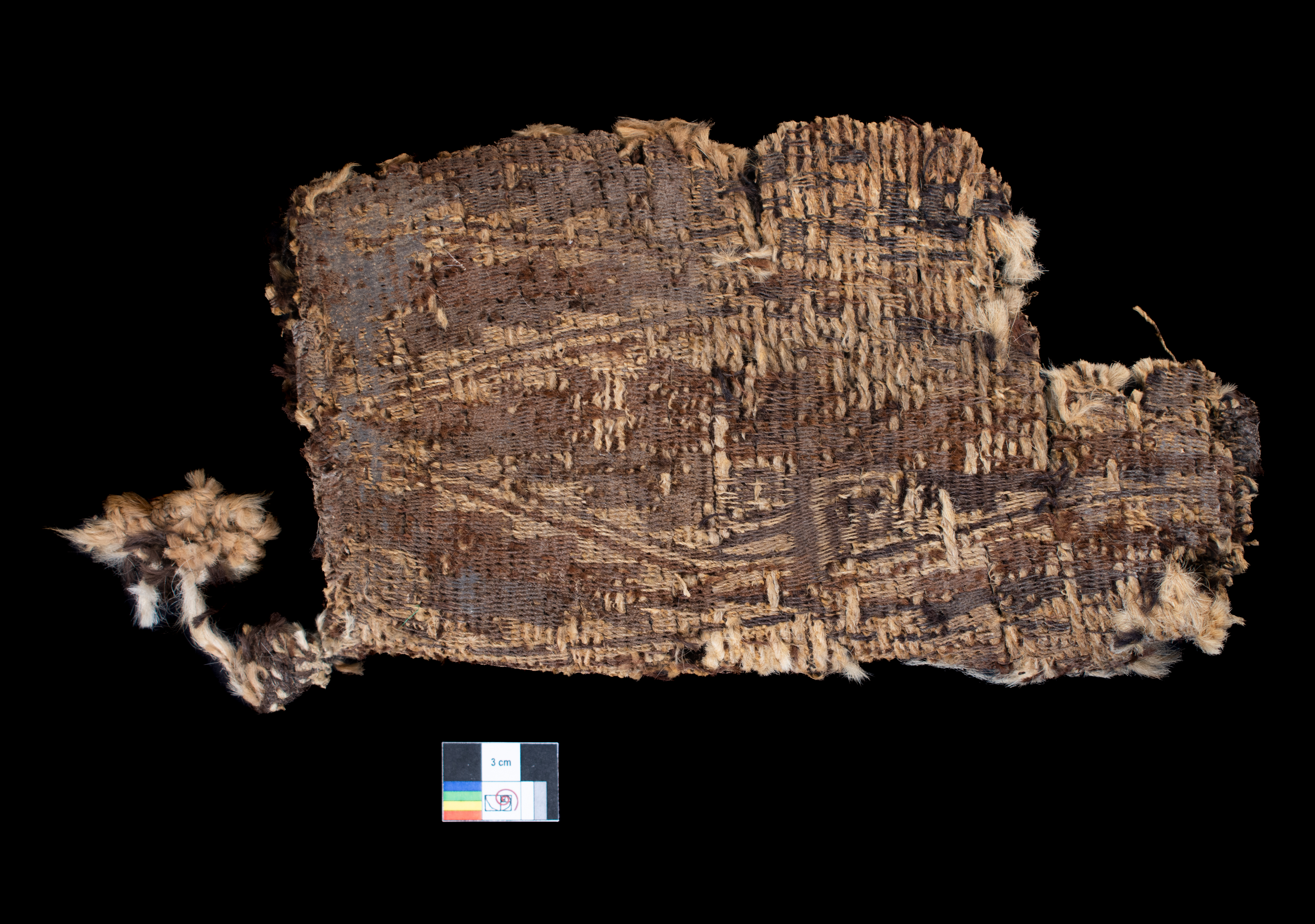 Fragmento de gorro trapezoidal, realizado en técnica de cestería, espiralado, con diseño de diagonales escalonadas. Colores utilizados, tostado, marron y crema. Tejido en lana de camélido y algodón.