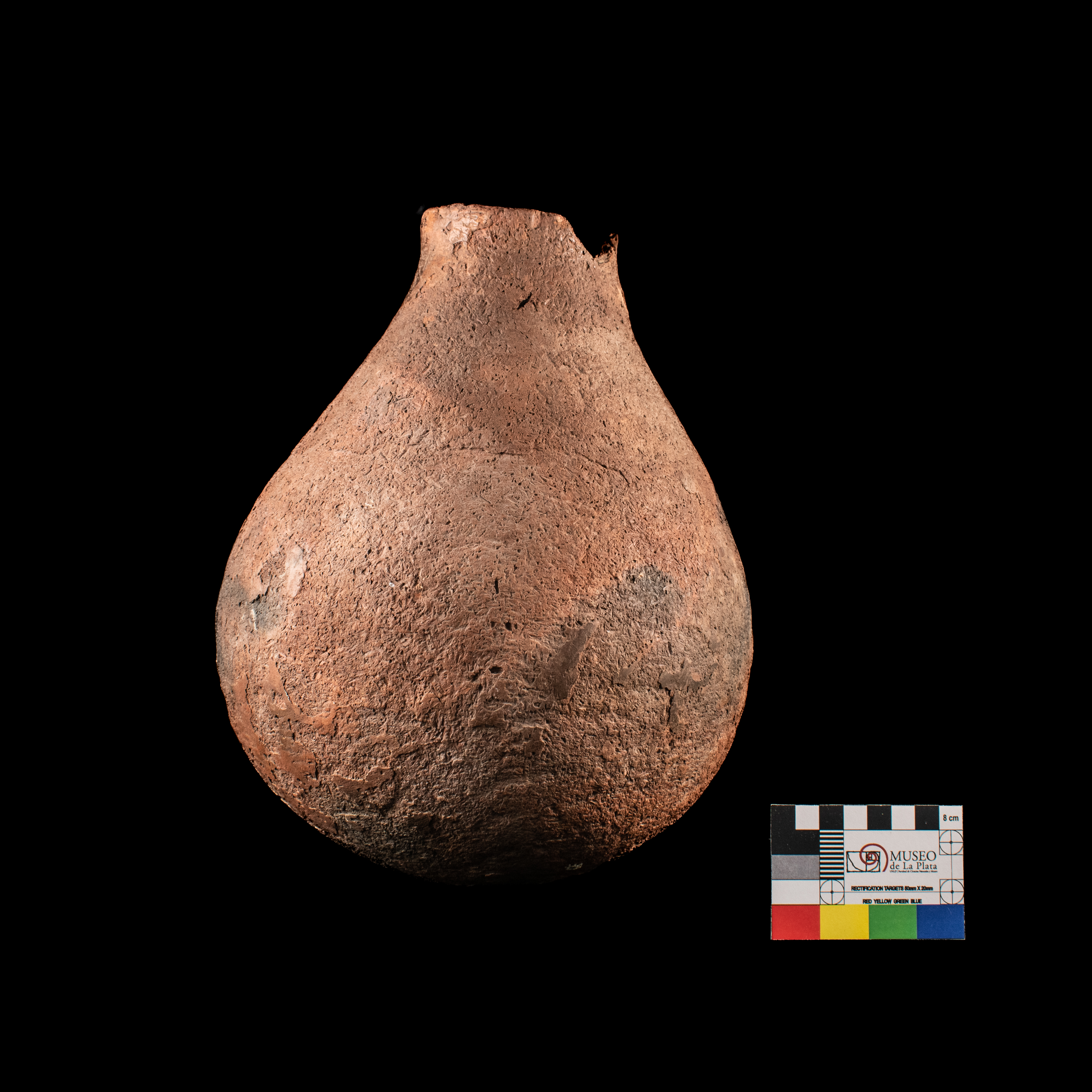 Vasija grande, globular, sin base definida (redondeada), con cuello