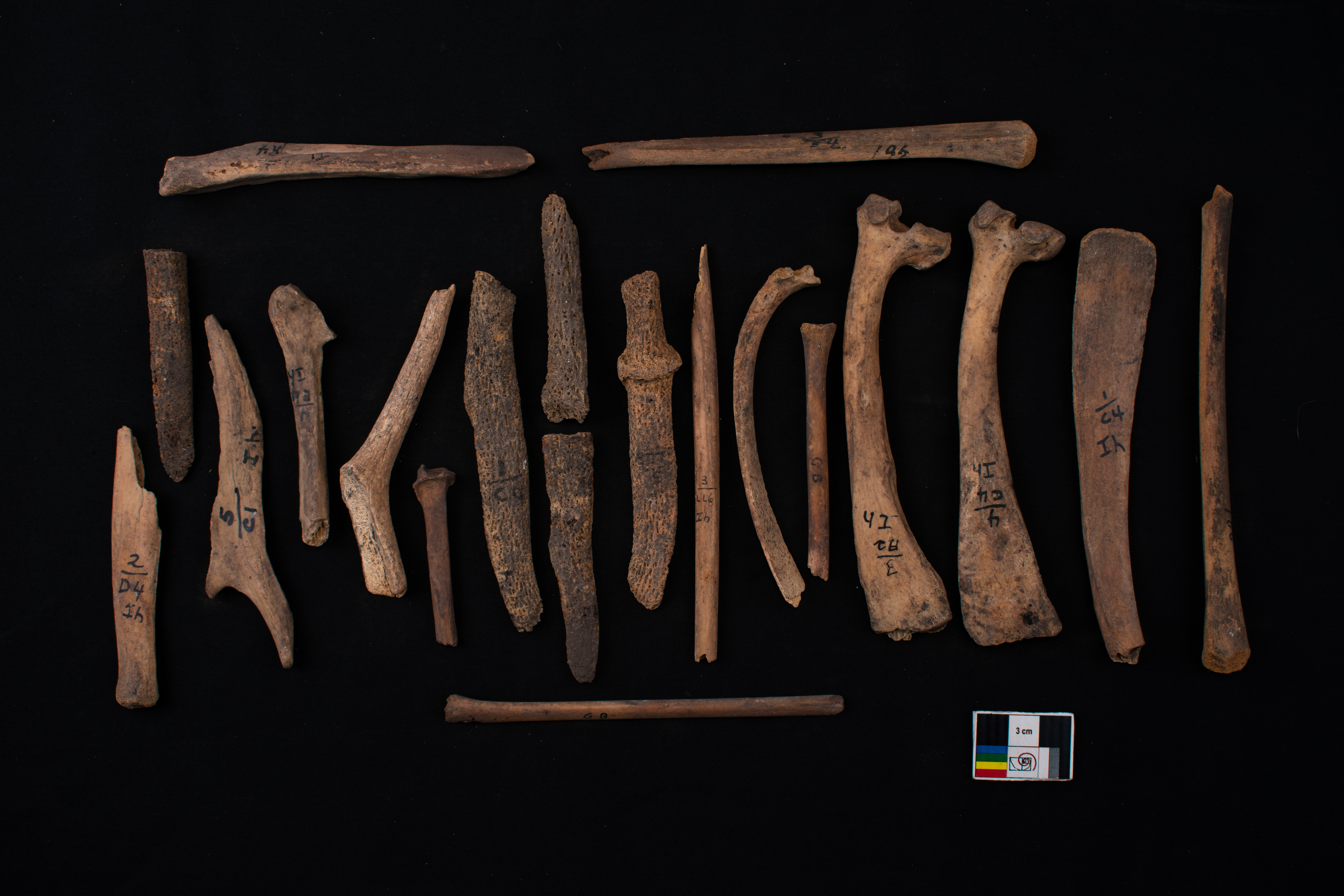 Se observan fragmentos de costillas, astas, huesos largos y otros indeterminados