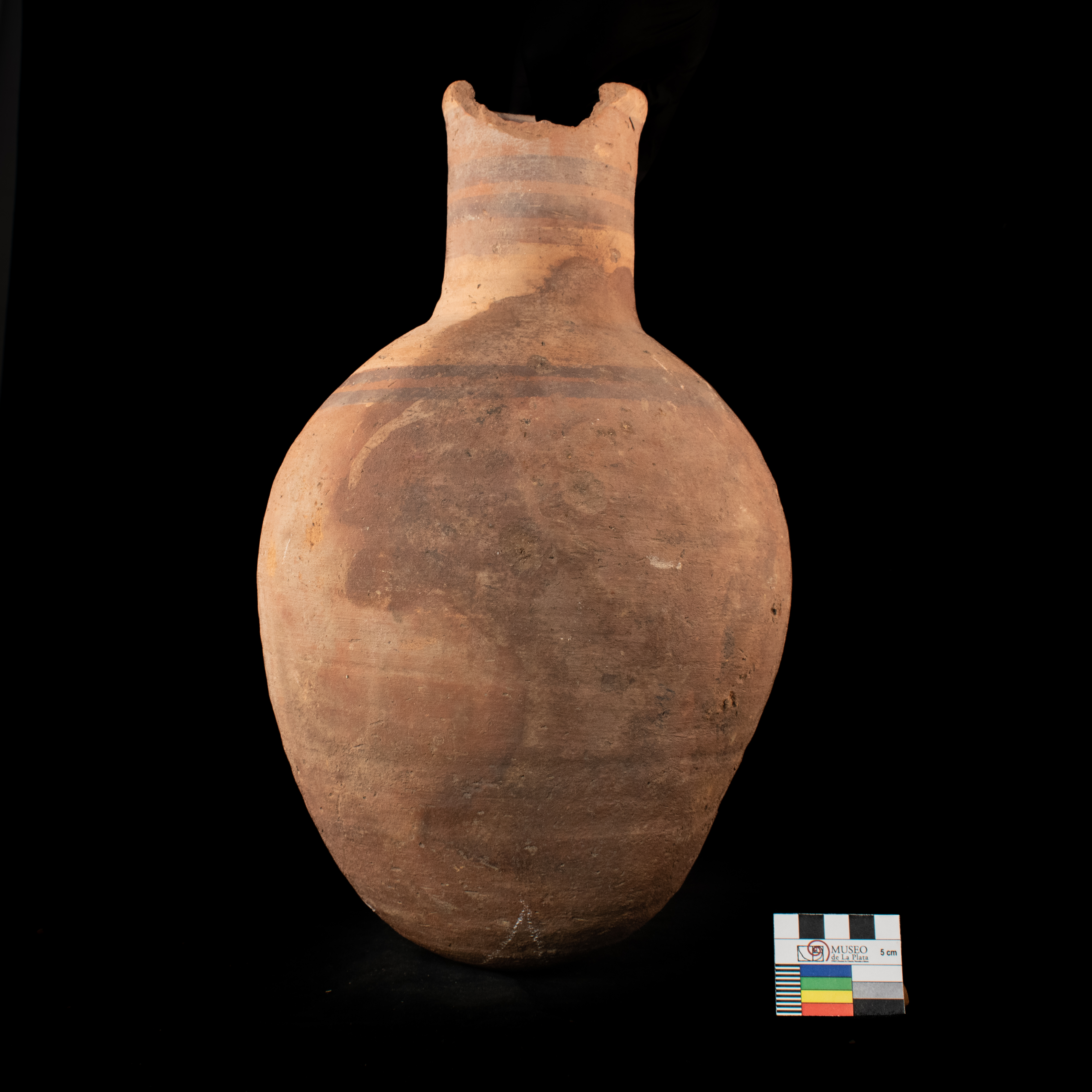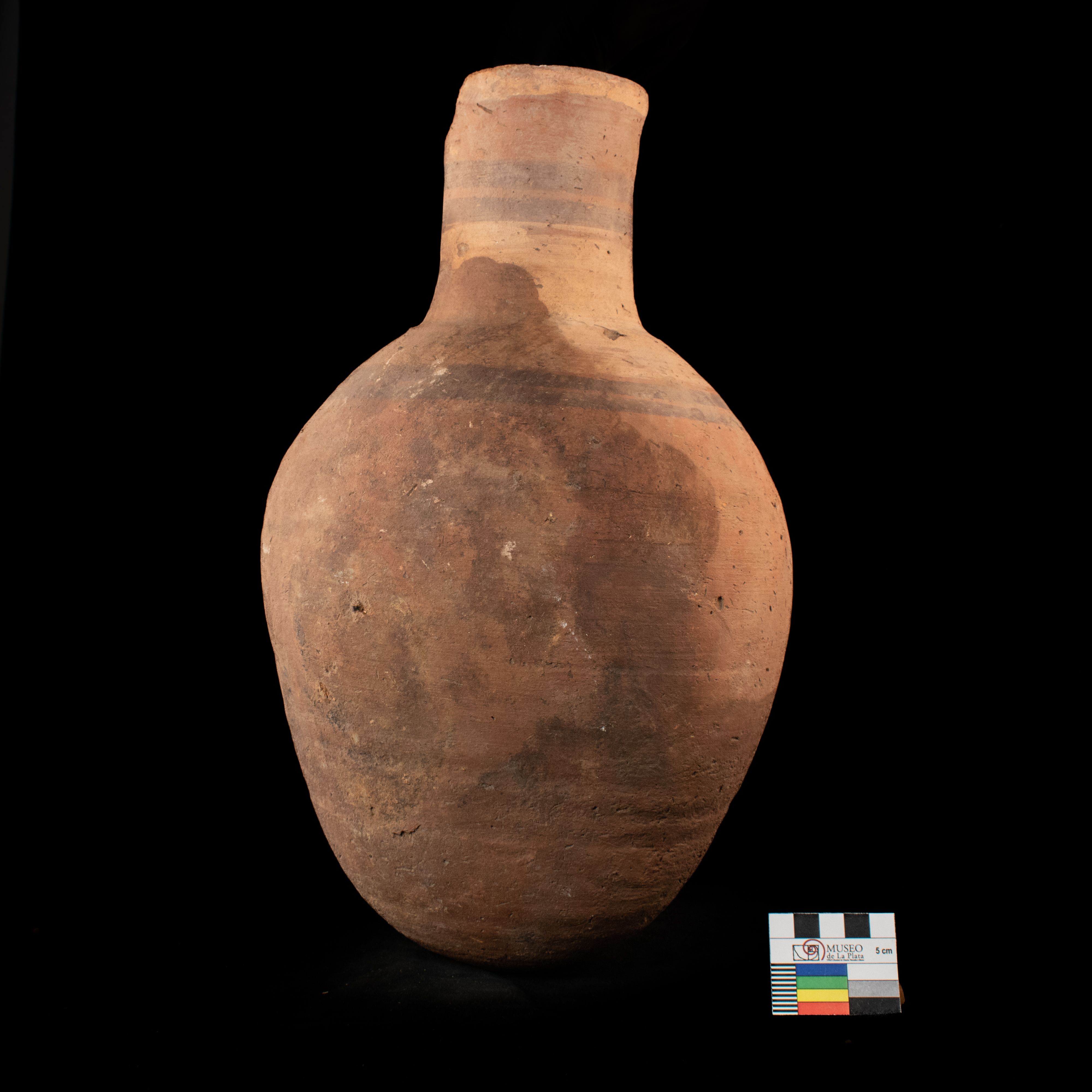 Vasija grande, sin base definida (redondeada), con cuello, pintada con dos lineas negras en el cuerpo y otras dos en el cuello